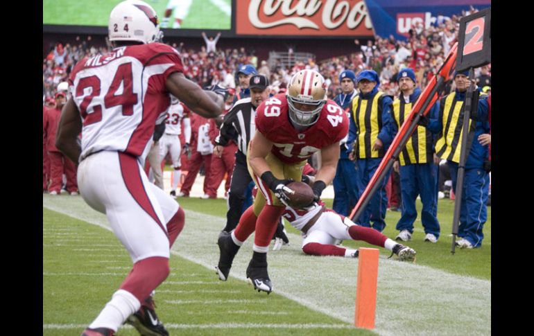 Deportes | Los 49ers vencen 23-7 a los Cardenales y están a punto de ganar su división San Francisco sigue enrachado en la NFL Los 49ers vencen 23-7 a los Cardenales y están a punto de ganar su división Por: AP 20 de noviembre de 2011 - 18:45 hs El equipo de San Francisco está a punto de ganar la División Oeste de la Nacional. EFE / SAN FRANCISCO, CALIFORNIA (20/NOV/2011).- Alex Smith consiguió el domingo 267 yardas por aire y dos touchdowns y los 49ers de San Francisco forzaron cinco pérdidas de balón para doblegar 23-7 a los Cardenales de Arizona en un partido pasado por agua en el Candlestick Park. Smith completó sendos pases de anotación con Kyle Williams y Vernon Davis en las dos primeras ofensivas del tercer período para empujar a los 49ers a su octava victoria en fila. San Francisco (9-1) puede ganar la División Oeste de la Conferencia Nacional con un triunfo en Baltimore el jueves, combinado con una derrota de Seattle contra Washington el próximo fin de semana. Patrick Willis, Donte Whitner y Dashon Goldson le interceptaron pases a John Skelton. El quarterback de los Cardenales (3-7) perdió por primera vez en tres partidos de esta temporada como titular en reemplazo del lesionado Kevin Kolb. Temas NFL Futbol Americano 49ers de San Francisco Cardenales de Arizona Lee También Liga MX: Horarios y canales de los partidos del 18 de octubre Futbol hoy 18 de octubre de 2025: ¿Dónde ver los partidos en vivo? Atlético San Luis le pasa por encima a un Atlas sin rumbo Atlético de San Luis vs Atlas • Momentos Destacados • Jornada 13 • Apertura 2025 Recibe las últimas noticias en tu e-mail Todo lo que necesitas saber para comenzar tu día Registrarse implica aceptar los Términos y Condiciones