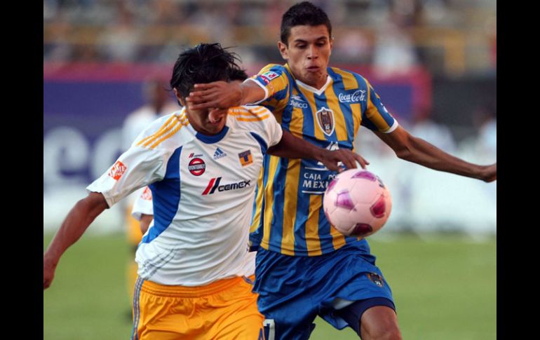 Othoniel Arce (der.) fue el autor del gol de lso Gladiadores, en la imagen lucha por el balón con Damián Álvarez de Tigres. MEXSPORT /