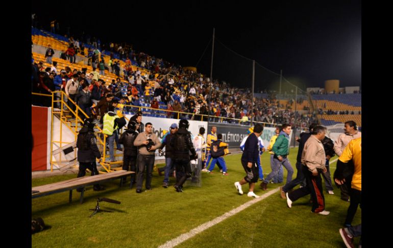 Deportes | El triunfo de los del norte por 1-0 es opacado por una trifulca en la tribuna San Luis y Tigres dan la mala nota en la Copa MX El triunfo de los del norte por 1-0 es opacado por una trifulca en la tribuna Por: NTX 15 de enero de 2014 - 10:10 hs SAN LUIS POTOSÍ, SAN LUIS POTOSÍ (15/ENE/2014).- En medio de una bronca que suspendió el partido por más de media hora, Tigres de la UANL derrotó al San Luis 1-0 en su partido de ida del Grupo Dos de la Copa MX disputado en el estadio Alfonso Lastras. La solitaria anotación del conjunto neoleonés fue de Francisco Torres apenas a los siete minutos de tiempo corrido, lo que le permitió manejar el encuentro, aunque luego se vio presionado por el cuadro potosino que buscó el empate afanosamente. Sin embargo, la bronca que se registró en las tribunas del inmueble y que al parecer inició en la barra de Tigres por una presunta bengala, provocó que los jugadores se refugiaran en los vestidores mientras pasaba el zafarrancho que llegó hasta la cancha. Luego de media hora que le llevó a las autoridades del estadio reubicar a los rijosos del cuadro visitante, el partido se reanudó en el segundo tiempo con un cuadro sanluisino desbordado en busca de la igualada que no consiguió y sufrió su primera derrota de la Copa. Con este triunfo el cuadro felino sumó sus primeros tres puntos del torneo en el sector Dos, cuyo líder es Correcaminos de la UAT que venció 4-1 al Puebla que está en el fondo de la tabla sin puntos junto con San Luis. Bueno el trabajo del silbante Jesús Bisguerra y por el cuadro tunero amonestó a Jesús Castillo, mientras que por Tigres pintó de amarillo a Damián Álvarez, Dieter Vargas y Jesús Dueñas. Alineaciones: San Luis.- Jesús Gallardo, Alexis Loera (Jorge Vázquez, 29), Néstor Olguín, Rodrigo Vera, Jesús Castillo, Cristian Gordillo, Jhair Alaffita, David Castro, Guillermo Clemens (Alejandro Castillo, 63), Eder Guerrero (Pablo Lavandeira, 68) y Omar Marrufo. DT Miguel de Jesús Fuentes. UANL.- Sergio García, José Rivas, Antonio Arreguín, Abel Fuentes, Edgar Pacheco, Jesús Dueñas, Francisco Torres, Gerardo Lugo (Jorge Espericueta, 77), Damián Alvarez (Luis Castillo, 63), Dieter Vargas (Emmanuel Segura, 60) y Uvaldo Luna. DT Ricardo Ferretti. Temas Futbol Mexicano Gladiadores de San Luis Tigres Copa MX Lee También ¿Quién ganará el partido entre las América y Chivas? Esto dice la IA ¿Cuál es el mercado techado más grande de Hispanoamérica? México vs. Argentina: Hora de alzar el pecho La sinfonía teutona suena en Sinsheim Recibe las últimas noticias en tu e-mail Todo lo que necesitas saber para comenzar tu día Registrarse implica aceptar los Términos y Condiciones