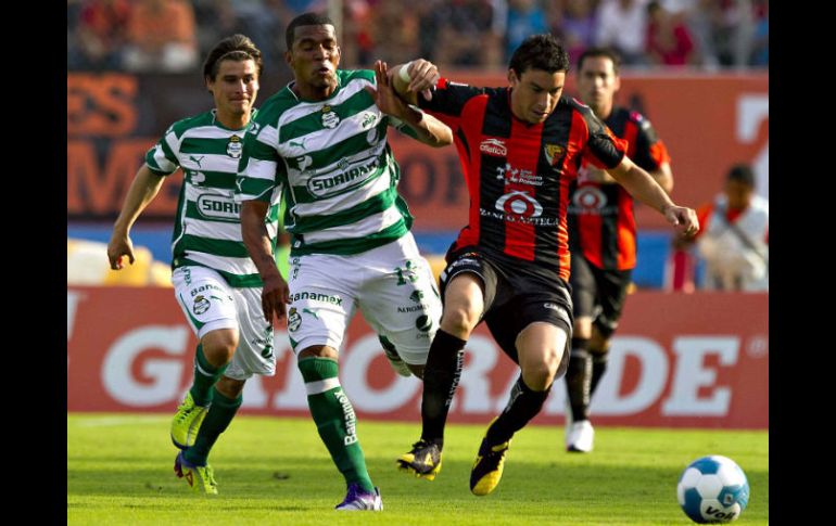 Deportes | La escuadra lagunera queda igualada por los chiapanecos 2-2 Santos pierde ventaja ante Jaguares La escuadra lagunera queda igualada por los chiapanecos 2-2 Por: NTX 20 de noviembre de 2011 - 17:12 hs Chistian Valdez (C-D) de Jaguares pelea por el balón con Christian Suarez (C-I) de Santos. AFP / TUXTLA GUTIERREZ, CHIAPAS (20/NOV/2011).- Jaguares de Chiapas sacó vida de su duelo de ida de los cuartos de final de la liguilla del Torneo Apertura 2011 del futbol mexicano contra Santos Laguna, al empatar 2-2 en el último minuto en duelo disputado en el estadio Víctor Manuel Reyna. Las anotaciones que le dieron la ventaja momentánea en el marcador al cuadro lagunero fueron del panameño Felipe Baloy, apenas en el minuto cuatro, y de Oribe Peralta en el 32, mientras los colombianos Jackson Martínez (83) y Franco Arizala (90), le dieron la igualada a Jaguares. Temas Futbol Mexicano Jaguares de Chiapas Santos Laguna Torneo Apertura 2011 Lee También Atlas Femenil paga caro un error y ve alejarse la Liguilla ante América Cada partido será una final para nosotros: Diego Cocca México encadena cuatro partidos sin ganar, algo que no sucedía desde 2021 ¿Dónde ver Argentina vs Colombia: semifinal del Mundial Sub-20? Recibe las últimas noticias en tu e-mail Todo lo que necesitas saber para comenzar tu día Registrarse implica aceptar los Términos y Condiciones