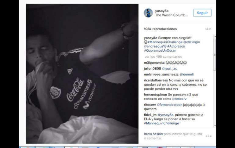 GUADALAJARA, JALISCO (10/NOV/2016).- El portero del Granada español y de la Selección Mexicana, Guillermo Ochoa, publicó ayer en su cuenta de Instagram un breve video en el que él, Giovani dos Santos y Andrés Guardado aparecen inmóviles, acometiendo lo que se ha dado en llamar el "reto del maniquí"El "reto del maniquí", o "mannequin challenge" en inglés, consiste en grabar un video en que los participantes permanecen inmóviles mientras son grabados desde diversos ángulos por la cámara.El fenómeno se ha vuelto viral en internet. Celebridades del espectáculo y del deporte, como el equipo Juventus de Italia o los Acereros de Pittsburgh, han ofrecido sus propias versiones.En el video publicado por Ochoa, la cámara se mueve mostrando a los jugadores inmóviles: a Giovani dos Santos tendido sobre una cama, mordiendo una manzana mientras Guardado y Ochoa lo atacan con una almohada y una botella.Los jugadores de la Selección se encuentran concentrados para el partido de mañana en Columbus, Ohio contra Estados Unidos en la eliminatoria mundialista.
