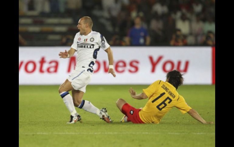 Deportes | El jugador holandés sufre un estiramiento por lo que no jugaría ante el Mazembe Sneijder se podría perder la final El jugador holandés sufre un estiramiento por lo que no jugaría ante el Mazembe Por: EFE 16 de diciembre de 2010 - 08:31 hs El jugador holandés salió lesionado del partido semifinal del Mundial de Clubes. EFE / ABU DHABI, EMIRATOS ÁRABES UNIDOS (16/DIC/2010).- El holandés Wesley Sneijder, centrocampista del Inter de Milán, es duda para la final del Mundial de Clubes, que disputará el sábado ante el Mazembe congoleño, tras sufrir un estiramiento en el primer minuto de la semifinal contra el Seongnam surcoreano. Sneijder, una vez efectuados los correspondientes exámenes médicos, padece un estiramiento de segundo grado en el bíceps femoral de la pierna izquierda. Mientras, el técnico español Rafa Benítez podrá contar en la final con el lateral diestro brasileño Maicon, quien se ha ejercitado hoy junto al resto de compañeros en el estadio de las Fuerzas Armadas de Abu Dhabi. Temas Futbol Internacional Inter de Milán Wesley Sneijder Mundial de Clubes de la FIFA Lee También Una extraña “reunión privada” en Washington Estados Unidos anuncia nueva multa por cruzar ilegalmente sus fronteras Futbol hoy 16 de octubre de 2025: ¿Dónde ver los partidos en vivo? Atlas Femenil paga caro un error y ve alejarse la Liguilla ante América Recibe las últimas noticias en tu e-mail Todo lo que necesitas saber para comenzar tu día Registrarse implica aceptar los Términos y Condiciones