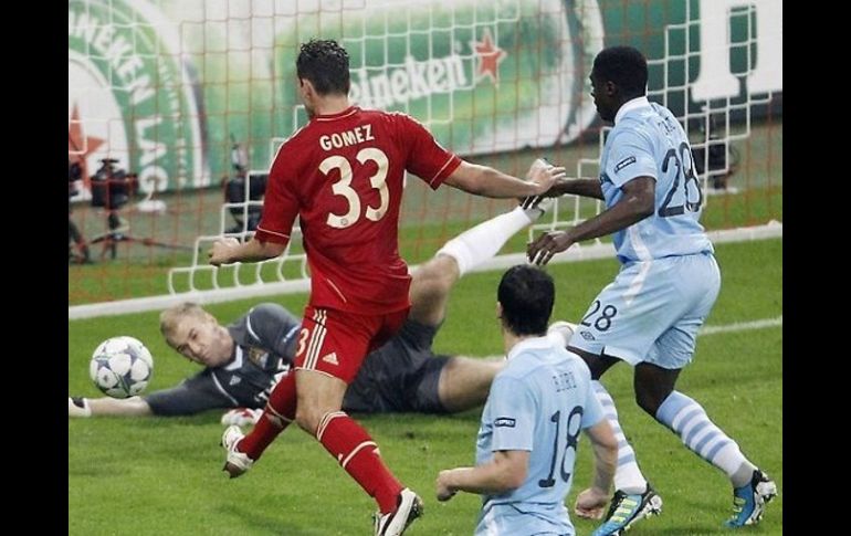 Mario Gómez (33) anota en el arco defendido por Joe Hart y Kolo Toure del Manchester City. REUTERS  /