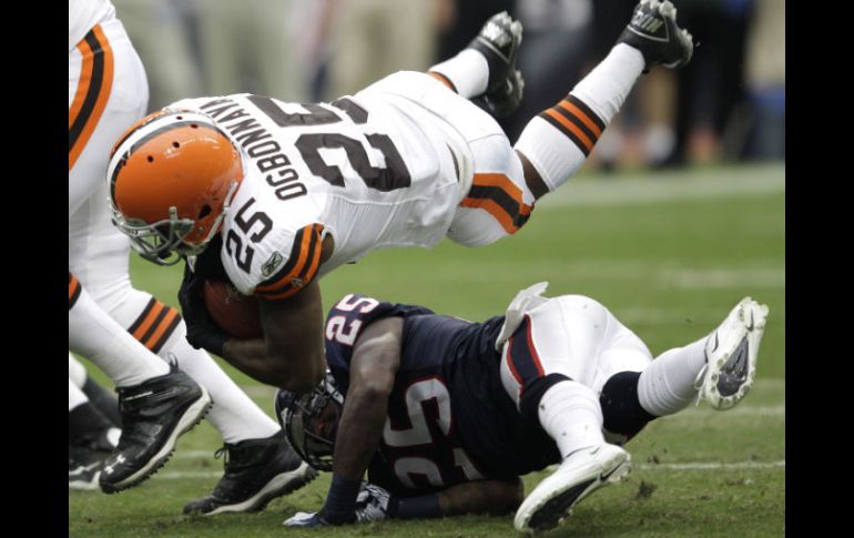 Deportes | Los Cafes apenas acumularon 172 yardas, perdieron 12-30 ante Houston Texanos apabullan a Cleveland Los Cafes apenas acumularon 172 yardas, perdieron 12-30 ante Houston Por: AP 6 de noviembre de 2011 - 16:29 hs Ogbonnaya perdió el balón en su primer acarreo y finalizó con 28 yardas en 13 oportunidades. AP / HOUSTON, TEXAS (06/NOV/2011).- Arian Foster corrió para 124 yardas, mientras que Ben Tate acarreó 115 y ambos anotaron el domingo en la victoria de los Texanos de Houston por 30-12 sobre los Cafes de Cleveland. Los Texanos (6-3), que jugaron sin el wide receiver lesionado Andre Johnson por quinto partido consecutivo, tuvieron a dos corredores con más de 100 yardas cada uno por segunda ocasión en tres semanas. Por primera vez se encuentra con una foja de tres triunfos por arriba de .500. Los Cafes (3-5) acumularon apenas 172 yardas, el tercer oponente de Houston contenido en menos de 200 yardas. Colt McCoy, en su primer partido como titular en el estado donde empezó como universitario, fue detenido atrás cuatro veces y completó sólo 14 pases para 146 yardas con una intercepción. McCoy tuvo poco apoyo de su antiguo compañero en Texas Chris Ogbonnaya, que empezó con los corredores Peyton Hillis y Montario Hardesty en la banca. Ogbonnaya perdió el balón en su primer acarreo y finalizó con 28 yardas en 13 oportunidades. Temas NFL Futbol Americano Cafés de Cleveland Texanos de Houston Lee También ¿Dónde ver EN VIVO el partido amistoso México vs Ecuador? Qatar estará en el Mundial 2026: lista de las selecciones que ya tienen boleto FOTOGALERÍA: Aficionados alientan antes del partido contra Ecuador en Guadalajara Sudáfrica volverá a disputar un Mundial 16 años después Recibe las últimas noticias en tu e-mail Todo lo que necesitas saber para comenzar tu día Registrarse implica aceptar los Términos y Condiciones