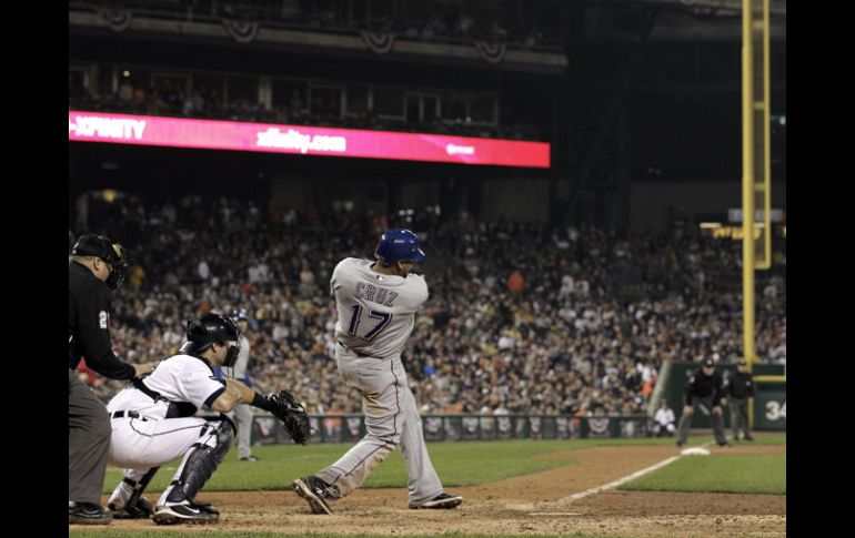 Deportes | Los Rangers vencen 7-3 a los tigres de Detroit y se ponen 3-1 en la serie Texas, en la puerta de la Serie Mundial Los Rangers vencen 7-3 a los tigres de Detroit y se ponen 3-1 en la serie Por: AP 12 de octubre de 2011 - 22:16 hs Nelson Cruz conecta el cuadrangular que asegura la victortia a los Rangers. AP / DETROT, MICHIGAN (12/OCT/2011).- Nelson Cruz hizo el miércoles un certero y veloz lanzamiento para mantener el empate y luego conectó un cuadrangular de tres carreras en la 11ra entrada para guiar a los Rangers de Texas a la victoria por 7-3 sobre los Tigres de Detroit y ponerlos adelante 3-1 en la serie de campeonato de la Liga Americana. Cruz, cuyo grand slam en la 11ra permitió ganar el segundo partido, volvió a figurar con los Rangers en un partido que comenzó con un retraso de más de dos horas por lluvia. Cuando Detroit tenía corredores en las esquinas en la octava y con la pizarra en 3-3, Cruz atrapó un elevado de Delmon Young en el jardín derecho y realizó un gran lanzamiento al receptor Mike Napoli para sacar al venezolano Miguel Cabrera. Napoli bateó un sencillo en la 11ra y Cruz agregó pronto su cuarto jonrón en la serie de campeonato. Cruz se convirtió en el primer jugador en la historia de las mayores que conecta un par de cuadrangulares en extrainnings en la misma serie de postemporada. Texas intentará el jueves obtener su segundo título de liga consecutivo, enviando al montículo a C. J. Wilson para enfrentar al astro de los Tigres Justin Verlander. La serie de campeonato de la Liga Americana ha marcado un cambio tremendo para Cruz. Luego de batear un imparable en 15 oportunidades en el triunfo sobre Tampa Bay en la primera ronda de la postemporada, ha conectado cinco hits en 14 veces al bate con nueve carreras producidas en sólo cuatro juegos contra los Tigres. Siete de esas anotaciones impulsadas han ocurrido en el 11er episodio. Austin Jackson fue golpeado por un lanzamiento en la parte baja de la 10ma entrada con un out, pero Napoli lo retiró en un intento de robo de base, y el relevista Scott Feldman terminó el capítulo con un ponche. Feldman obtuvo la victoria, mientras que el cerrador dominicano de Texas Neftalí Féliz trabajó el 11er episodio. Por los Rangers, los venezolanos Elvis Andrus de 5-1 con una anotada y una empujada, y Yorvit Torrealba de 5-1. Los dominicanos Adrián Beltré de 4-0 con una anotada y Nelson Cruz de 4-1 con una anotada y tres remolcadas. Por los Tigres, los venezolanos Miguel Cabrera de 2-1 con dos impulsadas y Víctor Martínez de 5-1. Los dominicanos Jhonny Peralta de 3-0 y Ramón Santiago de 4-0. Temas Beisbol MLB Serie de Campeonato de la Liga Americana Rangers de Texas Tigres de Detroit Lee También Dodgers va a la Serie de Campeonato; Chicago fuerza a quinto juego Atlas aprovecha la pausa para recuperar elementos clave Chivas y América calientan en redes el Clásico Nacional de la Fecha FIFA Dónde ver EN VIVO los juegos de MLB, HOY 9 de octubre Recibe las últimas noticias en tu e-mail Todo lo que necesitas saber para comenzar tu día Registrarse implica aceptar los Términos y Condiciones