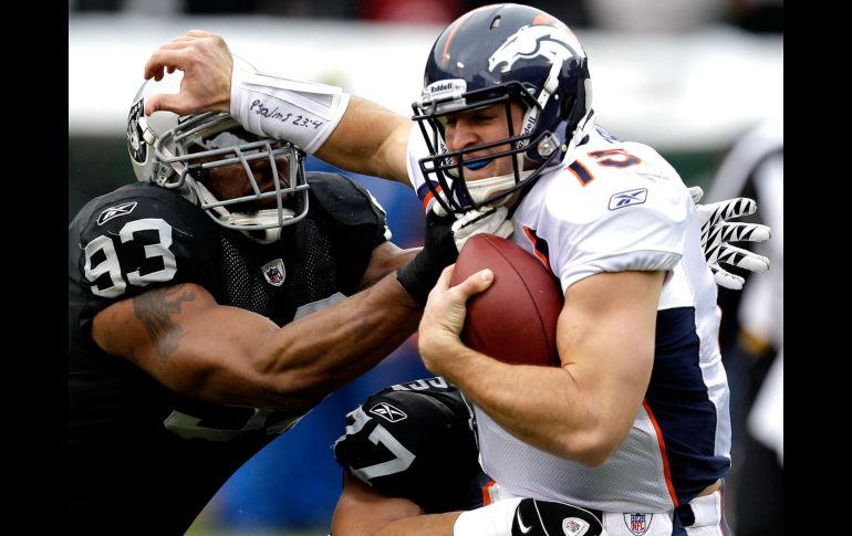 Deportes | Raiders vencen a Broncos 39-23 Tim Tebow debuta con derrota Raiders vencen a Broncos 39-23 Por: AP 19 de diciembre de 2010 - 18:42 hs Tebow, mariscal debutante de los Broncos, es alcanzadopor dos defensivos de Oakland. AP / OAKLAND, ESTADOS UNIDOS (19/DIC/2010).- Jason Campbell lanzó el domingo un pase de anotación de 73 yardas a Marcel Reece y Jacoby Ford anotó tras una carrera de 71 yardas para que los Raiders de Oakland se sobrepusieran a dos touchdowns largos del debutante Tim Tebow y vencieran a los Broncos de Denver por 39-23. Michael Bush aportó dos carreras cortas de anotación para que los Raiders, con marca de 7-7, siguieran al menos una semana más en la contienda por la postemporada. Oakland está dos juegos abajo de Kansas City en la División Oeste de la Conferencia Americana y necesita ganar los dos últimos partidos de la campaña regular y esperar otros resultados para llevarse el título divisional. Los Broncos, con foja de 3-11, están eliminados desde hace varias semanas y perdieron nueve de sus últimos diez partidos para empatar el récord de derrotas en una temporada del equipo. Tebow se convirtió en el tercer jugador que lanza un pase de anotación de al menos 30 yardas y corre al menos 40 para anotar otro touchdown en el mismo partido. Temas NFL Futbol Americano Broncos de Denver Raiders de Oakland Lee También El Tricolor entrenó en Guadalajara tras la humillación ante Colombia México Sub-20 regresa al país tras eliminación ante Argentina Futbol hoy 12 de octubre de 2025: ¿Dónde ver los partidos en vivo? Nos quedamos con sensaciones cortas: Eduardo Arce Recibe las últimas noticias en tu e-mail Todo lo que necesitas saber para comenzar tu día Registrarse implica aceptar los Términos y Condiciones