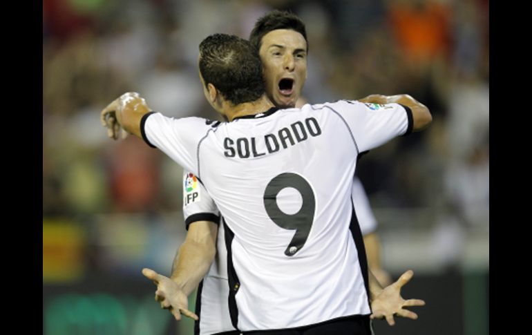 Soldado felicita a Aduriz, autor del primer tanto del Valencia. AP /