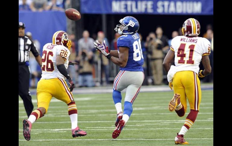 Deportes | El receptor completo un pase de 77 yardas para anotar en la última ofensiva de Gigantes Víctor Cruz da la victoria a Gigantes El receptor completo un pase de 77 yardas para anotar en la última ofensiva de Nueva York Por: AP 21 de octubre de 2012 - 15:30 hs Víctor Cruz (cemtro) captura el pase con el que Gigantes terminó ganando el partido. AP / NEW MEADOWLANDS, N.J. (21/OCT/2012).- Eli Manning lanzó un pase de touchdown de 77 yardas a Víctor Cruz con 1:13 por jugarse y los Gigantes de Nueva York supieron reaccionar tras una anotación del novato sensación Robert Griffin III al vencer el domingo por 27-23 a los Pieles Rojas de Washington. El pase de Manning a Cruz se produjo apenas dos jugadas y 19 segundos después de que Griffin coronara la que hubiera sido la ofensiva de la victoria, de 77 yardas, con un pase de anotación de 30 yardas a Santana Moss. Griffin mantuvo con vida la posesión con un pase de 19 yardas, luego de escapar de la presión en un cuarto down y 10 por avanzar dentro de su territorio, y luego con una corrida de 24 yardas en la siguiente jugada. Sin embargo, Cruz superó la marca de Josh Wilson y Madieu Williams, y los más de 80 mil aficionados en el MetLife Stadium celebraron mientras Manning alzaba el puño en señal del triunfo. Griffin parecía conducir a Washington para lograr otra anotación, pero Moss fue tacleado por Chase Blackburn tras una recepción de 11 yardes y el novato Jayron Hosley recuperó el balón en la 43 de Washington. Temas NFL Futbol Americano Gigantes de Nueva York Pieles Rojas de Washington Recibe las últimas noticias en tu e-mail Todo lo que necesitas saber para comenzar tu día Registrarse implica aceptar los Términos y Condiciones