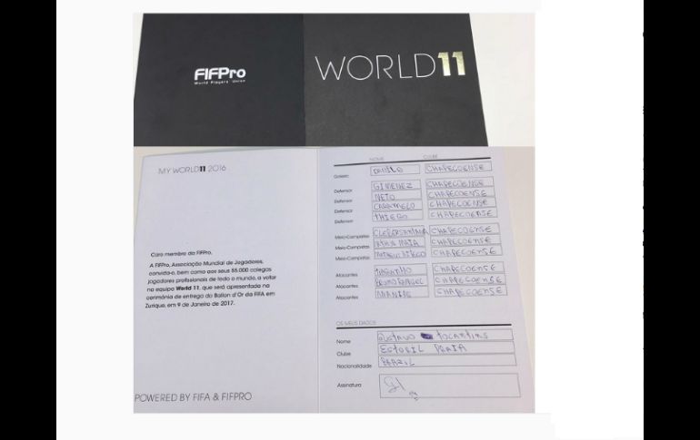GUADALAJARA, JALISCO (01/DIC/2016).- Un futbolista brasileño rindió un peculiar homenaje al equipo Chapecoense, tras el accidente de avión del pasado lunes: convirtió a las víctimas en sus candidatos al mejor futbolista del mundo.El autor del gesto fue Gustavo Tocantins, capitán del Estoril Praia, de Portugal. Como miembro de la FIFA, le tocaba participar en la votación para el premio FIFA/FIFPro World XI, que reconoce a los mejores futbolistas en cada posición.Lo que hizo Tocantins fue anotar a jugadores del Chapecoense en cada posición y luego publicó su boleta en redes sociales, con un comentario para explicarse: “Me vi obligado a escoger sólo 11, pero mi intención era hacer ese homenaje a todos los jugadores del Chapecoense (….) Que el cielo prepare un lugar para cada uno de ustedes, que para todo el mundo son verdaderos héroes”.En el accidente del lunes, ocurrido sobre Medellín, Colombia, murieron 71 personas, incluidos 19 jugadores del equipo brasileño. El luto que produjo la tragedia ha provocado numerosas reacciones en el mundo del futbol profesional.