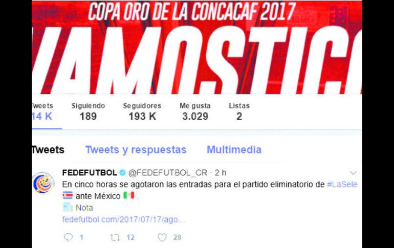 SAN JOSÉ, COSTA RICA (18/JUL/2017).- En cuestión de cinco horas se agotaron las 26 mil entradas puestas a la venta para el partido entre Costa Rica y México del próximo 5 de septiembre por las eliminatorias al Mundial de Rusia 2018.La Federación Costarricense de Futbol (Fedefutbol) señaló a través de su página web que los boletos salieron a la venta para el público a las 10:00 horas locales y a las 15:00 horas se habían terminado.“Estamos inmensamente agradecidos con la afición ya que en los últimos partidos de la Selección hemos jugado a estadio lleno. Esperábamos que para este partido las entradas se vendieran rápido, pero sí nos sorprendió la respuesta de los ticos y eso hizo que superaran nuestras expectativas”, manifestó el presidente de la Fedefutbol, Rodolfo Villalobos.El enfrentamiento será en el Estadio Nacional de San José, que tiene una capacidad para 35 mil aficionados. Sólo salieron para venta al público 26 mil entradas pues el resto corresponde a compromisos con patrocinadores e invitados especiales.“Esta euforia refleja el apoyo que tiene la afición hacia nuestra Selección, lo cual lo agradecemos día con día porque esto lo jugamos todos”, dijo Villalobos.Costa Rica visitará a Estados Unidos el 1 de septiembre y cuatro días después recibirá a México en dos partidos del Hexagonal Final de la Concacaf rumbo a Rusia 2018.Tras disputarse seis de las diez jornadas del Hexagonal, México es líder con 14 puntos, seguido por Costa Rica (11).