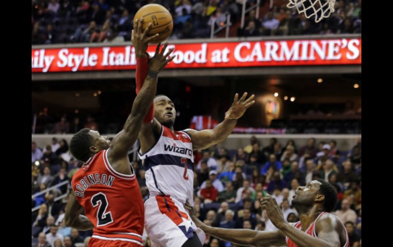 Wall aportó 27 puntos (8-17, 0-0, 11-13), nueve asistencias y ocho rebotes que lo dejaron al frente de una lista de cinco jugadores que tuvieron números de dos dígitos. Mientras que el veterano pívot Emeka Okafor hizo un mate (clavada) en el minuto final del tiempo reglamentario que dio la ventaja definitiva a los Wizards. El equipo de Washington consiguió el octavo triunfo consecutivo en su campo del Verizon Center y Wall tiene promedios de 23,7 puntos y 8,6 asistencias. El base reserva A.J.Price consiguió 13 puntos y fue el segundo máximo encestador de los Wizards, mientras que el escolta de origen dominicano Trevor Ariza, Okafor y el pívot brasileño Nené Hilario anotaron 10 tantos cada uno. Hilario jugó 28 minutos en los que anotó cinco de 11 tiros de campo, capturó siete rebotes --cinco fueron defensivos--, dio cuatro asistencias y puso un tapón. Como equipo, los Wizards (28-46), eliminados de la fase final, lograron un 42 (33-78) por ciento de acierto en los tiros de campo y el 46 (6-13) de triples, comparados al 39 (35-89) y 22 (5-23), respectivamente, de los Bulls, que también perdieron el duelo bajo los aros al capturar 45 rebotes por 51 de Washington. Los Wizards tienen como objetivo concluir la temporada regular con la mejor marca entre los equipos que no van a estar en la fase final y para eso necesitan superar a los Sixers de Filadelfia, que son novenos en la Conferencia Este. La meta a conseguir por los Wizards es encomiable después que iniciaron la temporada con racha perdedora de 4-28 y ahora ya se encuentran a tan sólo dos juegos y medio de alcanzar a los Sixers. El ala-pívot Carlos Boozer encabezó el juego de los Bulls al conseguir un doble-doble de 19 puntos, 12 rebotes y cinco asistencias, que no impidieron la quinta derrota del equipo de Chicago en los últimos 10 partidos disputados. El base Nate Robinson salió de reserva y fue el sexto hombre de los Bulls al aportar 17 puntos, mientras que el alero sudanés Luol Deng y Jimmy Butler lograron 13 tantos cada uno. El pívot Nazr Mohammed, que siguió de titular por la baja de Joakim Noah, sumó un doble-doble de 12 tantos, 12 rebotes, tres asistencias y puso un tapón. Los Bulls (40-33), que siguen también con las bajas del base Derrick Rose, el escolta italiano Marco Belinelli y Richard Hamilton, siguen sextos en la Conferencia Este, pero se alejan un juego de los Hawks de Atlanta (43-33), que son quintos y tuvieron jornada de descanso.