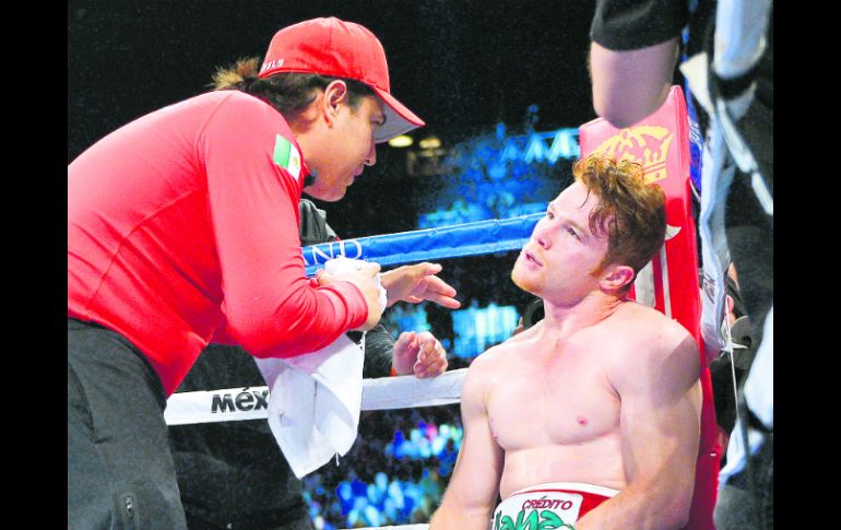 Saúl Álvarez escucha las instrucciones de su entrenador Eddy Reynoso durante el tercer episodio de la pelea del sábado. AP /
