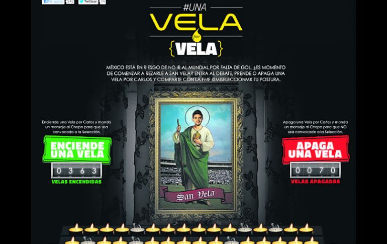 Deportes | Crean página en internet para pedir al delantero en el equipo de ''Chepo'' Y por enésima ocasión, la afición pide a Vela Crean página en internet ''www.velaporvela.com'', para pedir al delantero de la Real Sociedad en el equipo de ''Chepo'' Por: EL INFORMADOR 6 de julio de 2013 - 04:08 hs Esta es la pantalla de la página web de las ''velas'' de Carlos, hecha por aficionados del Tri. ESPECIAL / GUADALAJARA, JALISCO (06/JUL/2013).- Los malos resultados de la Selección mexicana en lo que va del año, con una pronta eliminación en Confederaciones, un paso irregular en el hexagonal rumbo al Mundial y con gran incertidumbre de cara a la Copa Oro, han provocado que los aficionados busquen un “salvador”, que podría ser Carlos Vela. “México está en riesgo de no ir al Mundial por falta de gol. ¿Es momento de comenzar de rezarle a San Vela? Entra al debate, prende o apaga una vela por Carlos y comparte con la FMF @miseleccionmx tu postura”, dice el portal www.velaporvela.com En esta página, creada por aficionados, se dan razones a favor y en contra de un nuevo llamado de Vela al Tricolor que dirige el “Chepo” de la Torre. Entre los puntos positivos están el título Sub-17 que obtuvo con el Tri en el 2005, en un Mundial en el que fue el goleador; además, su buena participación en la Liga Española con la Real Sociedad; así como su experiencia internacional. En contra tiene que los aficionados lo consideran indisciplinado y le recuerdan la fiesta en el Tri que le costó ser suspendido seis meses; también señalan que “no quiere venir”, ante sus constantes negativas; y, finalmente, los temas extra cancha. Con estos argumentos invitan a prender o apagar una vela por el jugador, en una votación que, hasta el momento, va ganando el sí con más de 360 votos, mientras que las negaciones apenas superan las 60. Twitter El hashtag #UnaVelaPorVela ha ganado poco a poco popularidad en redes sociales, sobre todo en Twitter, más aún cuando la selección no pasa por un momento, que se refleja en las estadísticas que tiene en 2013: Con 12 duelos disputados, ocho empates, dos victorias y las mismas derrotas, con sólo nueve goles anotados y diez recibidos... por eso quieren prender una Vela. Con información de NTX LO QUE SIGUE Al entrar a la página www.velaporvela.com, el usuario elige si el delantero debe ser convocado al Tricolor o no, y debe exponer sus razones. Es el único jugador, hasta el momento, que ha generado tal repercusión en internet en torno al Tri. Temas Futbol Mexicano Selección mexicana Carlos Vela Recibe las últimas noticias en tu e-mail Todo lo que necesitas saber para comenzar tu día Registrarse implica aceptar los Términos y Condiciones