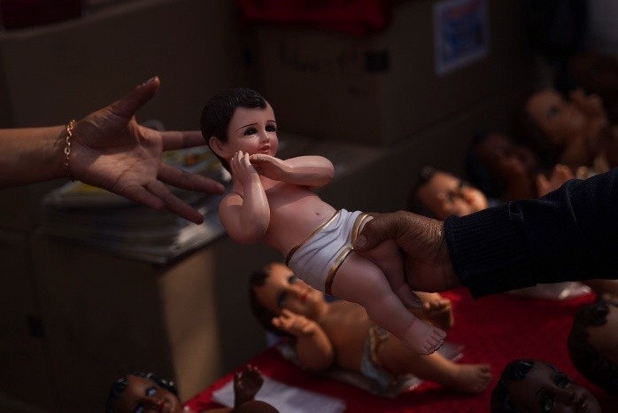 Son las tres de la tarde en un mercado que bulle entre las voces de compradores y comerciantes de objetos religiosos, pero no hay distracción que afecte el pulso de cirujano de Maximino Vértiz.Todo él es una mancha de pintura. Manos, uñas y ropa llevan la huella del oficio: restaurar estatuillas de yeso, cerámica y madera que los devotos católicos de Ciudad de México atesoran porque representan al hijo de Dios.Para Maximino estos son días ocupados. El 2 de febrero se celebrará el Día de la Candelaria, por lo que el mexicano de 49 años no alcanza a concluir la reparación de una figura cuando aparece a última hora un nuevo cliente que le pide recomponer la suya.Cada Día de la Candelaria las familias capitalinas suelen vestir a su niño Dios con alguna prenda que representa a un santo o alude a un milagro que desean. Desde temprano se reúnen para ir a misa y bendecir su estatuilla. La convivencia de la jornada adquiere más sabor con una comida en la que se sirven tamales.Las clientas de Maximino le entregan a sus niños Dios como cualquier madre confía sus hijos a un médico. Algunos están despostillados del pelo y hay que refrescar su pintura. Otros han perdido sus dedos. Varios más llegan en pedazos, envueltos en trapos de tela vieja."A esos les llamo rompecabezas", dice el hombre de tez morena y barba rala cuyas manos no sólo parecieran restaurar cerámica, sino darle continuidad a la fe que sus clientes depositan en sus niños Dios.Mientras Maximino usa una espátula para detallar los ojos de una figura que no rebasa los 20 centímetros de alto, una mujer aparece con una manta entre los brazos. Visiblemente angustiada, descubre a su estatuilla y revela la tragedia: el cuello se quebró y la cabeza está separada del cuerpo.A Maximino le gustaría ayudar en esta tarde de miércoles pero no le dan los tiempos. "Se lo tendría hasta el sábado, madre. Estoy lleno, lleno de trabajo".A los pocos minutos aparece otra devota para recoger a un niño que ya debería estar reparado. Maximino le prometió devolvérselo a las dos, pero ya pasan de las tres y la pintura no ha secado."Pero le quité lo feo, madre", dice tratando de justificar el retraso."¡Mi niño no estaba feo!", responde indignada la mujer.En su libro "Mi niño Dios", la antropóloga y restauradora Katia Perdigón explica que para los devotos ésta no sólo es una representación de Dios, sino que "se incluye dentro de una dinámica de interacción con lo humano, desde su creación y restauración, hasta los sentimientos que produce por su uso".Espiando la mesa de trabajo de Maximino, María Concepción Sánchez espera que el reparador le entregue a los tres niños Dios que le confió. El más grande es suyo. El otro par es de sus nietos."El güerito que tiene el señor tiene 50 años", dice la mujer de 65.María cuenta que a su mamá le gustaba mucho poner nacimientos, como se conoce entre los católicos a un despliegue de figurillas de cerámica que se colocan en los hogares antes de Navidad para representar la llegada al mundo de Jesucristo.A lo largo del proceso pueden ocurrir accidentes. María relata que las estatuillas de sus nietos de 7 y 8 años se quebraron mientras les ponían ropa nueva. A uno se le rompió un brazo y el otro se despedazó tras una caída. Ambos, por fortuna, quedarán casi como nuevos en manos del doctor de niños Dios.Maximino trabaja solo, sentado en un banquito acomodado en el hueco que le deja una suerte de escritorio que exhibe los implementos de su profesión. Pinceles, espátulas, frascos de pintura y contenedores con material para resanar. A su alrededor, acostados boca arriba, hay al menos una veintena de niños Dios.El mexicano cuenta que abrió su negocio en 2019, pero ha reparado estas figuras desde que tiene uso de razón. Se trata de un oficio legado por su padre, a quien ayudaba desde chico y en el mismo mercado tiene su propio local.Según Maximino, las figuras grandes son más fáciles de reparar que las pequeñas. Con las primeras puede tardar media hora; con las segundas, hasta tres. El precio de su trabajo oscila entre los 100 y los 250 pesos (de cinco a doce dólares) y se dice abierto a reparar todo tipo de material. Primero, pega la parte rota o cuarteada con resina. Luego pule la pieza y la resana. La pintura es el paso final.Uno de los últimos "rompecabezas" que restauró le pertenece a uno de los nietos de María. La mujer prefiere repararlo a comprar otro porque eso implica preservar una tradición que se transmite de generación en generación.Cuenta con orgullo que sus nietos ahorran para pagar la ropa que le pondrán a sus niños Dios desde noviembre y que ella conserva la figura que le heredó su mamá cuando murió hace 30 años. Entre ella y sus hermanos, reúnen una decena de estatuillas para vestir y celebrar en estas fechas.María dice que lo que más desea este año es buena salud. De sus 18 hermanos, sólo viven siete; tres fallecieron en 2022. "A unos (niños Dios) vamos a vestirlos como el niño de la salud y otros como cirujanos, porque ya estamos grandes y uno nunca sabe".Maximino ha terminado los ojos del niño de María y ahora se concentra en las cejas. Tan pronto se seque la pintura, la estatuilla que está en sus manos podrá volver a casa como un bebé sano, sonriente y cachetón.JM