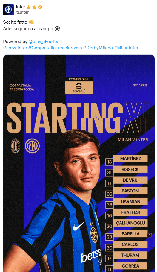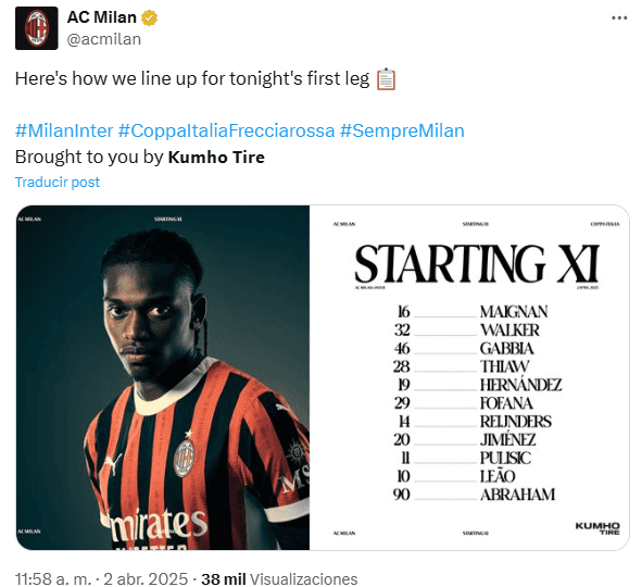 Deportes | EN VIVO | Milan vs Inter de Milán: minuto a minuto de la semifinal de la Copa Italia Sigue los detalles del partido del futbol italiano Oralia López 2 de abril de 2025 - 14:55 hs 1 ‒ 1 Termina el partido Todo se definirá en la vuelta. ¡Empata el Inter! Calhanoglu anota para el Inter e iguala el marcador al 67. ¡Goool del Milan! Abraham abre el marcador para los locales al minuto 46. Comienza el segundo tiempo Los jugadores regresan al campo e inicia el segundo tiempo. Termina el primer tiempo El árbitro decreta el medio tiempo. El partido se mantiene sin goles, con mayor dominio por parte del Inter. ¡Arranca el partido! Rueda el balón en San Siro. Listas, las alineaciones del partido Los equipos dan a conocer el "11" con el que saltarán al terreno de juego. El mexicano Santiago Giménez, de los rossoneri, va a la banca. Temas AC Milan Inter de Milán Futbol Internacional Futbol italiano santiago gimenez copa de italia Lee También El sombrío cierre de fase regular para Atlas en el Clausura 2025 Trump OFICIALIZA 25% de aranceles a autos fabricados fuera de EU Agúndez y Estudillo, la nueva pareja en clavados sincronizados Atlético de Madrid vs Barcelona: Dónde ver EN VIVO la semifinal de la Copa del Rey