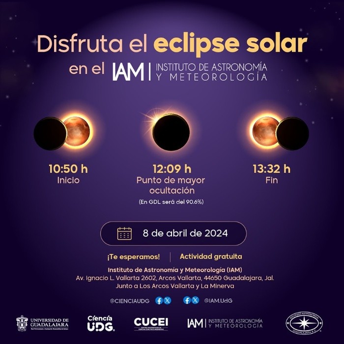 Jalisco | Actividades imperdibles que habrá en Guadalajara para disfrutar del eclipse ¿No sabes qué hacer durante el eclipse solar del próximo lunes? Checa las siguientes actividades que habrá en la ciudad El Informador 4 de abril de 2024 - 12:58 hs 1 Zoológico de Guadalajara El Zoológico Guadalajara tendrá actividades especiales durante el lunes 8 de abril, enfocadas en toda la familia, con un costo de 200 pesos. Habrá especialistas que guiarán a los visitantes a través de las fases del eclipse, además de que se observará cómo el fenómeno influye en los animales y su comportamiento. 2 Instituto de Astronomía y Meteorología (IAM) En el Instituto de Astronomía y Meteorología (IAM) las actividades iniciarán a las 10:00 horas y la entrada será por avenida Vallarta. En el instituto se llevarán a cabo observaciones en los jardines, con telescopios adaptados, proyectores y transmisión de la señal del eclipse total. 3 Planetario Lunaria El planetario Luanaria, a partir de las 10 de la mañana, tendrá actividades para toda la familia, e invitan a los tapatíos al picnic bajo el eclipse. Habrá además el siguiente itinerario: 10:00 / Arma tu caja para ver el eclipse 10:50 / Observación con telescopios 10:50 / Observación con gafas solares 10:50 / Observación indirecta 11:30 / Mitos y leyendas / Cuentacuentos 4 Centro Universitario de Ciencias Exactas e Ingenierías (CUCEI) En el caso del CUCEI, el punto de observación del eclipse será en la explanada del Módulo Y, con los tres métodos seguros de observación desde las 10:00 horas, además de que en el auditorio del Módulo Z se realizará la proyección vía streaming.