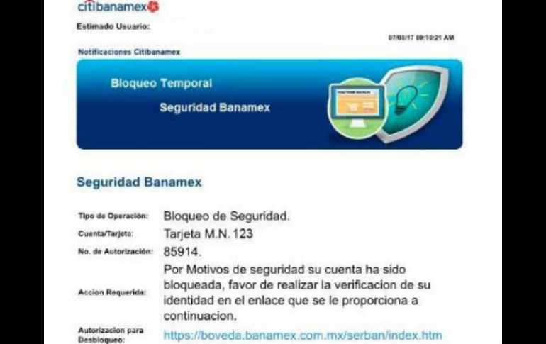 CIUDAD DE MÉXICO (07/AGO/2017).- La Comisión Nacional para la Protección y Defensa de los Usuarios de los Servicios Financieros (Condusef) alertó por la presencia de un nuevo correo falso de Citibanamex con el cual se pretende defraudar a clientes bancarios.Según el organismo, a través de un correo electrónico se notifica a los usuarios que por motivos de seguridad su cuenta fue bloqueada y debe realizar la verificación de su identidad en el enlace https://boveda.banamex.com.mx/serban/index.htm"La Condusef reitera que los enlaces contenidos en este tipo de correos llevan al usuario a sitios falsos, donde solicitan datos como nombre, domicilio, contraseñas, número de identificación personal (NIP), número de cuenta bancaria de tarjetas de crédito o débito y cualquier otra información particular", explicó.En ese sentido, el organismo hizo un llamado a los usuarios a no dejarse engañar por este tipo de correos, que sólo buscan obtener información personal y financiera para cometer fraudes.En ese sentido recordó a los usuarios de servicios financieros no responder a ningún mensaje de correo sospechoso o remitentes desconocidos; nunca ingresar contraseñas, sobre todo bancarias, a algún sitio al que se llegó por correo electrónico así como evitar proporcionar información financiera y llamar directamente a la institución bancaria ante cualquier duda.