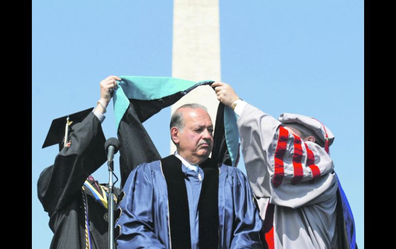 Economía | Decenas de manifestantes sonaron cornetas y silbatos para tratar de interrumpir el acto Carlos Slim recibe grado universitario entre protestas Decenas de manifestantes sonaron cornetas y silbatos para tratar de interrumpir el acto Por: EL INFORMADOR 21 de mayo de 2012 - 02:11 hs “Necesitamos educación, educación, educación, y empleo, empleo y más empleo”, dijo Carlos Slim al recibir el reconocimiento. EFE / WASHINGTON, ESTADOS UNIDOS (21/MAY/2012).- El magnate de las telecomunicaciones Carlos Slim recibió el grado honorario en Gestión Pública de la Universidad George Washington por su labor filantrópica, mientras grupos de inmigrantes mexicanos realizaban una protesta en su contra. Con el emblemático obelisco de fondo, Slim recibió el grado durante una ceremonia de graduación al aire libre en la explanada conocida como el “Mall” de Washington. El empresario mexicano, que en junio de 2009 recibió la “Medalla del Presidente” de la misma universidad, ofreció un breve discurso en inglés en el que alentó a los recién graduados a tomar riesgos y enfrentar los desafíos con optimismo. “Necesitamos educación, educación, educación, y empleo, empleo y más empleo”, dijo Slim. “Debemos dejar atrás un mundo mejor para nuestros niños, pero más importante aún, mejores niños para nuestro mundo”. “Vivan con un sentido de urgencia cuando estén creando, cuando estén innovando, cuando estén resolviendo problemas... muchas veces van a cometer errores, es humano, pero que sean pequeños: acéptenlos, corríjanlos y olvídenlos, no se obsesionen con ellos”, aconsejó Slim ante casi mil personas, entre estudiantes y algunos de sus familiares. Cuando Slim comenzó su discurso, decenas de manifestantes, quienes se encontraban a una cuadra de la tarima, sonaron cornetas y silbatos para tratar de interrumpir el acto, pero el ruido solo se escuchó a lo lejos. Los grupos de inmigrantes denunciaban lo que consideran tarifas abusivas y prácticas monopólicas de las compañías telefónicas de Slim. “Los precios en México están demasiado altos y (Slim) se está aprovechando del sistema, de las reglas, del gobierno de México y aprovechándose de la gente, declaró Andrés Ramírez, de “Dos países, una voz”, uno de los grupos organizadores de la manifestación. La universidad dijo que lo concedía el grado a Slim “en reconocimiento a sus contribuciones al desarrollo empresarial y comunitario en México y América Latina, y a su extensa obra filantrópica”. Sus obras, aseguró, han “logrado mejoras e inversiones en educación, cuidado de salud, empleos y bellas artes, entre otras”. Slim recibió el grado junto al periodista de la cadena NBC, Brian Williams, y la artista y graduada de la universidad, Clarice Smith. FICHA TÉCNICAUna empresa bajo la lupa México es el principal destino de llamadas internacionales provenientes de Estados Unidos, con 117 mil 750 millones de minutos en 2008, frente a los nueve mil 300 millones de minutos en llamadas a Europa, explicó la Oficina del Representante Comercial estadounidense (USTR) en un informe. A principios de mayo, la Comisión Federal de Competencia de México revocó una multa de 11 mil 989 millones de pesos impuesta hace un año a Telcel, a cambio de compromisos para rebajar la tarifa de conexión a otros operadores Temas Empresas Carlos Slim Lee También Portada: Dr. José Magaña, embajador de Arkana México ¿Quiénes son las joyas del Tri Sub-17 para el Mundial de Qatar 2025? Sociales: El Informador inicia una nueva etapa con la moderna imprenta "Doña Stella" Andy López Beltrán pagó ESTA cantidad por arte de Yayoi Kusama, revela Loret Recibe las últimas noticias en tu e-mail Todo lo que necesitas saber para comenzar tu día Registrarse implica aceptar los Términos y Condiciones