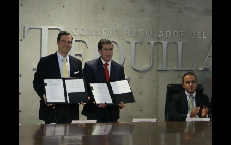 GUADALAJARA, JALISCO (31/MAY/2017).- Este miércoles Josafath Rodríguez Saldaña, primer vicepresidente del Consejo Regulador del Tequila (CRT) y Paulo Carreño King, director general de ProMéxico, firmaron un convenio de colaboración que busca principalmente tres puntos.1. Monitoreo y detección en los mercados internacionales de las bebidas alcohólicas etiquetadas como "Tequila", cuyas marcas o empresas envasadoras no estuvieran registradas ante el CRT.2. Brindar información a los productores de Tequila con el objeto de instruirlos sobre mercados potenciales para sus exportaciones.3. Colaborar en la educación de los consumidores locales por país, en lo que respecta a la normatividad y cultura del Tequila para promover el consumo de productos certificados únicamente.EL INFORMADOR / ARNOLDO HERNÁNDEZ