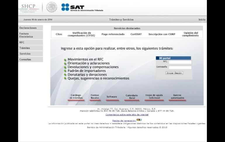 Economía | Publica nombre, razón social y RFC de los contribuyentes irregulares El SAT comparte lista actualizada de contribuyentes incumplidos Publica nombre, razón social y RFC de los contribuyentes irregulares Por: NTX 16 de enero de 2014 - 12:36 hs El 10 de enero pasado, el SAT dio a conocer también los datos de más de 160 empresas que simulan operaciones. ESPECIAL / CIUDAD DE MÉXICO (16/ENE/2014).- El Servicio de Administración Tributaria ( SAT) publicó este jueves en su portal de Internet información actualizada con los datos de contribuyentes incumplidos con la autoridad fiscal, en cumplimiento con las modificaciones realizadas al Código Fiscal de la Federación (CFF). Con información actualizada al 15 de enero de 2014, el organismo fiscalizador da nombre, razón social y RFC de los contribuyentes incumplidos, como lo hizo con una primera lista difundida el 1 de enero pasado en su página. Esta información corresponde a contribuyentes que se encuentren en los siguientes supuestos: que tengan créditos fiscales firmes; que tengan créditos fiscales que no han pagado o no han sido garantizados, que no sea posible localizarlos en su domicilio fiscal. Asimismo, que tengan sentencia condenatoria por haber cometido un delito fiscal, y que se les haya cancelado o condonado algún adeudo fiscal a partir del 1 de enero de 2014. El jefe del SAT, Aristóteles Núñez, dijo en entrevista en días recientes que los datos actualizados a publicarse este jueves ya depurarían información de algunos de los contribuyentes aparecidos en la primera lista y también aparecerían nuevos nombres. A partir del 1 de enero de 2014, el SAT publicó en su página una relación de los datos de contribuyentes incumplidos con la autoridad fiscal, con base en las excepciones que se establecieron a la reserva fiscal derivadas de la modificación al artículo 69 del CFF como parte de la reforma hacendaria. Así, el primer día de este año, el organismo fiscalizador publicó una primera lista con los datos de unos 89 mil contribuyentes incumplidos, y este jueves difundió una nueva relación con información actualizada. El 10 de enero pasado, el SAT dio a conocer también los datos de más de 160 empresas que simulan operaciones y emiten facturas apócrifas, con base en una adición del artículo 69B al Código Fiscal de la Federación. La relación de incumplidos puede consultarse en el portal del SAT en la liga: AQUÍ Temas Economía Mexicana SAT Impuestos IVA Lee También ¿Dónde ver EN VIVO el partido amistoso México vs Colombia? Dónde ver EN VIVO el México vs Argentina por el Mundial Sub-20 La actualidad de Diego Ochoa, formado en Chivas y destacado en el Mundial Sub-20 Caen las exportaciones de vehículos pesados Recibe las últimas noticias en tu e-mail Todo lo que necesitas saber para comenzar tu día Registrarse implica aceptar los Términos y Condiciones