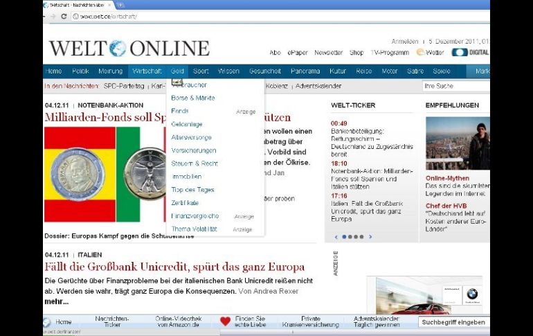 Economía | Podrá aportar fondos para auxiliar a los Estados más endeudados Fed podría dar préstamos a FMI para ayudar a zona euro El diario alemán Die Welt citó fuentes cercanas a las negociaciones, quienes aseguran que los 17 bancos centrales de la zona euro podrían pagar por lo menos 100 mil millones de euros a un fondo especial Por: REUTERS 4 de diciembre de 2011 - 17:25 hs En el diario Die Welt anlistas dicen que la iniciativa busca que el FMI sea capaz de igualar el poder de fuego del fondo de rescate. / WASHINGTON, ESTADOS UNIDOS (04/DIC/2011) - La Reserva Federal de Estados Unidos, junto con los 17 bancos centrales de la zona euro, podría proporcionar al Fondo Monetario Internacional (FMI) fondos que podrían utilizarse para auxiliar a los estados endeudados del bloque, informó el domingo un diario alemán. El diario Die Welt citó fuentes cercanas a las negociaciones, quienes aseguran que los 17 bancos centrales de la zona euro podrían pagar por lo menos 100 mil millones de euros a un fondo especial, que sería utilizado para los programas de las naciones que luchan por controlar sus deudas. "También otros bancos centrales, por ejemplo la Reserva Federal de Estados Unidos, al parecer estarían dispuestos a financiar una parte de los costos", informó el diario en un anticipo de un artículo que aparecerá el lunes. El secretario del Tesoro de Estados Unidos, Timothy Geithner, discutiría la idea en las próximas semanas cuando visite Europa, dijo el periódico. Autoridades habían dicho el sábado que las conversaciones por el tamaño de los préstamos de los bancos centrales de la zona euro estaban llegando a nivel técnico, después de que los ministros de Finanzas de la unión monetaria dieran el visto bueno para estudiar la idea. La iniciativa busca que el FMI sea capaz de igualar el nuevo poder de fuego del fondo de rescate de la zona euro, que está apalancado. Un funcionario de alto rango de la zona euro sostuvo que ninguna iniciativa había sido discutida en el ámbito político. La zona euro quiere aumentar los recursos del FMI para que el fondo pueda proporcionar un respaldo creíble si España e Italia necesitaran un programa de préstamos de emergencia. Geithner sostendrá conversaciones con varios líderes europeos la próxima semana, en las que los instará a tomar medidas decisivas en una cumbre de la UE destinada a evitar un descontrol de la crisis de deuda de la zona euro. Un funcionario del Tesoro dijo el viernes que Estados Unidos no tenía intención de hacer préstamos bilaterales con el FMI y que los recursos de la entidad crediticia son adecuados. Temas Crisis economía EU Economía Internacional FMI Crisis en Grecia Lee También Futbol hoy 12 de octubre de 2025: ¿Dónde ver los partidos en vivo? Nos quedamos con sensaciones cortas: Eduardo Arce Hay jugadores que no estuvieron a la altura: Javier Aguirre César Montes intenta justificar la goleada ante Colombia Recibe las últimas noticias en tu e-mail Todo lo que necesitas saber para comenzar tu día Registrarse implica aceptar los Términos y Condiciones