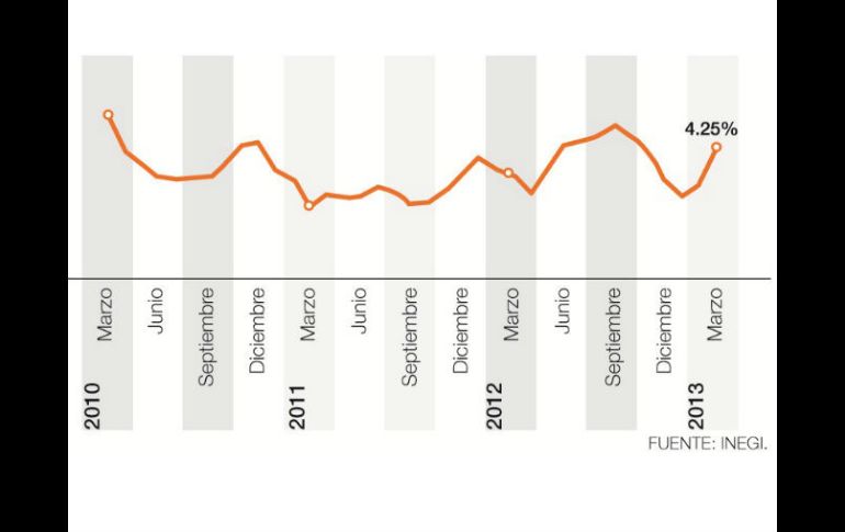 Economía | Suben 4.41% los precios de la canasta básica La inflación llega a 4.25 por ciento El dato sobre el alza en el índice de precios al consumidor fortalece la cotización del peso frente al dólar; su mejor nivel en 20 meses Por: EL INFORMADOR 9 de abril de 2013 - 23:54 hs Índice nacional de precios al consumidor. Variaciones porcentuales anuales. EL INFORMADOR / CIUDAD DE MÉXICO (10/ABR/2013).– El repunte de la inflación favoreció para que el peso tuviera otro día de fortaleza. En marzo, los precios al consumidor aumentaron en 0.73%, porcentaje por arriba de lo esperado. Con ello la inflación a tasa anual llegó a 4.25 por ciento. De esta forma, en marzo el índice de precios al consumidor estuvo por arriba de 0.68% previsto por analistas, mientras que en su comparación anual volvió a rebasar la barrera del 4.0 por ciento, desde 3.55% registrado en febrero pasado. El año pasado, México acumuló una inflación de 3.57 %, inferior a 3.82 % de 2011. El índice de precios subyacente, considerado un mejor parámetro para medir los precios debido a que elimina artículos de alta volatilidad, aumentó 0.30 % y dejó la tasa anual en 3.02 %, señaló el Instituto Nacional de Estadísticas y Geografía (Inegi). En tanto, el índice de precios de la canasta básica de consumo aumentó 0.52% en el tercer mes del este año, situando su tasa anual en 4.41%, mientras que en igual mes de 2012 las cifras fueron de 0.09% y 5.51%, respectivamente. El Banco de México (Banxico) prevé que la inflación anual siga aumentando los próximos meses, para después tomar una trayectoria a la baja y ubicarse cerca de 3 % en la segunda parte del año y en 2014. Tras conocerse el dato de la inflación, que en su repunte aleja la posibilidad de un recorte a las tasas de interés, el peso se apreció hasta alcanzar su mejor nivel en 20 meses El peso ganó 0.41% al cerrar en 12.32 por dólar, frente a los 12.37 del lunes, de acuerdo con información de Banamex. En la categoría interbancaria (operaciones de 48 horas al mayoreo), la moneda también ganó valor al cerrar en 12.13 frente a los 12.15 del lunes. La moneda mexicana registró así su mejor nivel desde principios de agosto del 2011. El súper peso impulsó a que el lunes la Comisión de Cambios del Banxico suspendiera las subastas diarias de ventas de dólares a precio mínimo, ya que “las condiciones que motivaron su establecimiento se han disipado”. El 29 de noviembre de 2011, la Comisión de Cambios anunció el establecimiento de un mecanismo en el cual se subasta a la venta diariamente 400 millones de dólares en caso de que el peso alcance una depreciación de 2 por ciento. Temas Economía Mexicana Inflación IPC Recibe las últimas noticias en tu e-mail Todo lo que necesitas saber para comenzar tu día Registrarse implica aceptar los Términos y Condiciones