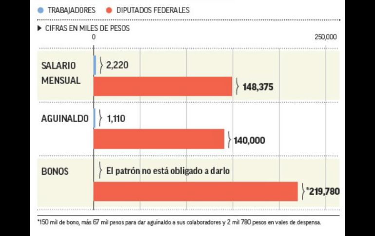 CIUDAD DE MÉXICO (06/DIC/2016).- Con un salario mínimo de 2 mil 220 pesos al mes y 26 mil 640 al año, un trabajador tendría que laborar 19.07 años, y guardar íntegros todos sus sueldos, para poder juntar los 508 mil 155 pesos que se llevarán los diputados federales sólo en este mes de diciembre.Si se considerara no sólo el sueldo anual sino también el aguinaldo del obrero, que corresponde a 15 días de trabajo, es decir mil 110 pesos, entonces, con esa bolsa de 27 mil 750 pesos, tendría que trabajar 18.3 años.Consideradas de las más altas del mundo, las prestaciones y sueldos de los diputados federales, en este diciembre, incluyen su salario mensual de 148 mil 375 pesos; un aguinaldo de 140 mil pesos; un bono extra de regalo de 150 mil; una partida de 67 mil pesos para dar aguinaldo a sus colaboradores en sus casas de gestión y 2 mil 780 pesos en vales de despensa.En cambio, un trabajador con sueldo mínimo apenas juntará 3 mil 330, entre sueldo y aguinaldo, este fin de año.Sin contar el bono navideño, tan sólo para obtener los 140 mil pesos de aguinaldo de un diputado, cada uno de los 7 millones 894 mil trabajadores que aún tienen el sueldo mínimo –según la ENOE– tendría que juntar su salario íntegro durante 5.25 años. O bien, debería juntar, intactos, sus aguinaldos durante más de 126 años. Dicho de otra forma, el aguinaldo de un solo diputado equivale al aguinaldo de 126 obreros.Y para poder ganar el sueldo anual de un legislador, los obreros de sueldo mínimo tendrían que trabajar casi 67 años. El trabajador gana al mes 2 mil 220 pesos, mientras que el legislador recibe 148 mil 375 mensuales.
