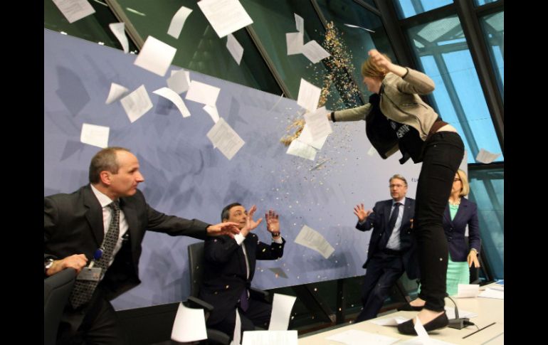 Economía | La conferencia de prensa que ofrecía es brevemente suspendida Una joven se abalanza sobre el presidente del BCE La mujer grita ''¡Alto a la dictadura del BCE!'', mientras lanza confetti Por: AFP 15 de abril de 2015 - 10:34 hs FRÁNKFORT, ALEMANIA (15/ABR/2015).- Una joven se abalanzó sobre Mario Draghi, presidente del Banco Central Europeo (BCE) este miércoles en la sede de la institución en Fránkfort durante una conferencia de prensa, que fue brevemente suspendida. La joven, de unos 20 años, que se había introducido entre los periodistas presentes, trepó a una mesa frente a Draghi gritando en inglés "¡Alto a la dictadura del BCE!", mientras lanzaba confettis. La joven fue escoltada fuera del lugar por los servicios de seguridad. Tras una breve suspensión, la conferencia de prensa de Draghi se reanudó. El BCE ha sido frecuentemente objeto de protestas pero es la primera vez que un manifestante se introduce en el edificio de la entidad e interrumpe de semejante manera una rueda de prensa. El mes de marzo, varias decenas de personas resultaron heridas durante las manifestaciones anticapitalistas organizadas con motivo de la inauguración en Fránkfort de la nueva sede del BCE. Temas Economía Internacional Manifestaciones en el mundo Banco Centro Europeo (BCE) Lee También “El diablo fuma”, una dura mirada al abandono infantil en el país María Fernanda Prieto da el paso natural en el cine Futbol hoy 14 de octubre de 2025: ¿Dónde ver los partidos en vivo? Recibe las últimas noticias en tu e-mail Todo lo que necesitas saber para comenzar tu día Registrarse implica aceptar los Términos y Condiciones