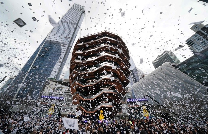 Hudson Yards, el colosal proyecto inmobiliario que ha dado lugar a un nuevo barrio en el oeste de Manhattan con la construcción de seis rascacielos, un centro comercial de más de 90 mil metros cuadrados, un nuevo colegio y un vanguardista espacio cultural, celebró este viernes su inauguración oficial."Cualquier persona que esté preocupada por el futuro de la vitalidad de Nueva York no tiene más que ver la transformación que está sucediendo aquí mismo", dijo en un discurso durante la ceremonia de inauguración de Hudson Yards el senador neoyorquino Chuck Schumer.El político, líder de la minoría demócrata del Senado de EU, recordó que la zona hasta hace pocos años estaba completamente "desierta", ya que servía como zona de estacionamiento de trenes, y destacó que el nuevo vecindario creará miles de puestos de trabajo para personas de todos los estratos sociales.Hudson Yards, además, no deja lugar a dudas de que la Gran Manzana sigue siendo un referente mundial, dijo Schumer, por delante de otras ciudades en Asia que han acelerado su desarrollo en los últimos años."Sabíamos que si Nueva York quería seguir siendo la ciudad global preeminente y estar por delante de Londres, Singapur y otros competidores tendríamos que modernizarnos", explicó el político neoyorquino frente al elemento más destacado del complejo, la escultura "The Vessel", de 45 metros de alto y que ha costado unos 200 millones de dólares.Schumer señaló asimismo que el impacto de Hudson Yards en el desarrollo de Nueva York durará "generaciones" en una ciudad que siempre ha "aceptado a cualquier persona que viene (...) para intentar alcanzar sus sueños".Por su parte, Stephen Ross, el presidente de Related Companies, una de las inmobiliarias que ha desarrollado Hudson Yards, afirmó que se ha "creado un nuevo modelo para el mundo, un barrio que apuesta por la sostenibilidad"."Hemos mostrado que Nueva York es y siempre será la mejor ciudad del mundo", zanjó el empresario.Mientras, el alcalde de Nueva York, Bill de Blasio, afirmó en un comunicado que en la Gran Manzana "lo imposible se vuelve realidad, como la construcción de un nuevo vecindario sobre un viejo descampado ferroviario"."El proyecto es un ejemplo de la ingenuidad que hace que Nueva York sea la mejor ciudad del mundo", apuntó De Blasio.Durante el evento, presentado por el popular periodista de la CNN Anderson Cooper, varios políticos estadounidenses y representantes de Related Companies y Oxford Properties, las compañías que han encabezado la construcción del complejo, inauguraron formalmente el espacio tirando de una gran cuerda que provocó una gran lluvia de confeti.Para amenizar el evento, la cantautora Andra Day, acompañada por bailarines de "The Ailey School", actuaron frente a la estructura "Vessel", en el que tuvieron la oportunidad de ser los primeros en adentrarse un centenar de destacadas personalidades neoyorquinas, desde líderes de la sociedad civil hasta actores de Broadway.La gran escultura, la pieza central de los jardines de Hudson Yards y diseñada por el arquitecto británico Thomas Heatherwick, está formada por más de dos mil 500 peldaños distribuidos en 154 tramos de escaleras que se interconectan para formar decenas de miradores desde los que los visitantes podrán admirar la zona oeste de Manhattan.Hudson Yards, considerado el proyecto inmobiliario privado más grande de la historia de EU, se autoproclama una "mezcla sin precedentes de edificios, parques, servicios públicos y espacios abiertos" que forman un vecindario "limpio, fiable y eficiente".Según Related Companies, el complejo ha sido diseñado para respetar el medio ambiente ya que, entre otras características, cuenta con una infraestructura que minimiza la emisión de gases invernadero y tiene la capacidad de recoger y filtrar decenas de millones de litros de agua de lluvia.JM