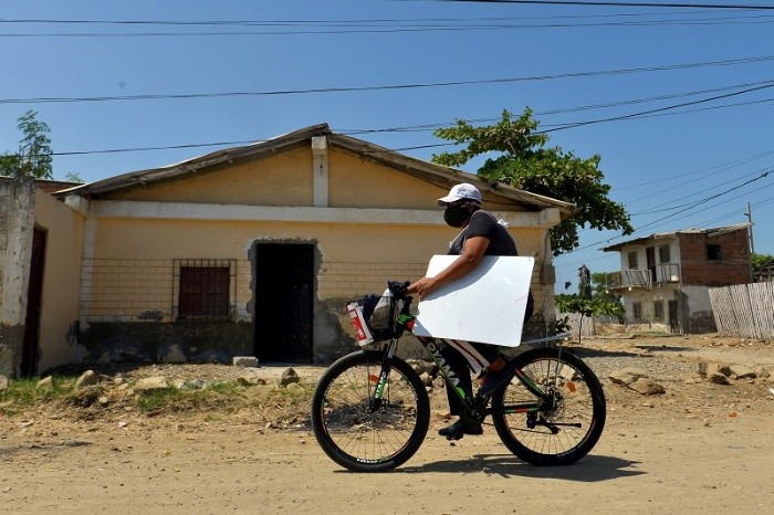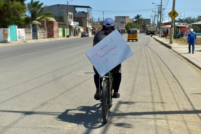 Pizarra en mano, la ecuatoriana Carolina Espinoza pedalea a diario varios kilómetros para llegar a casa de cada uno de los alumnos que, por falta de Internet, no han asistido a sus clases virtuales, en un cantón de la provincia del Guayas, donde el coronavirus SARS-CoV-2 hace aún más visible la pobreza.Docente desde hace nueve años en el cantón Playas de Villamil, Espinoza tiene 42 alumnos a su cargo, pero ahora también enseña temporalmente a otros 41 que se han quedado sin profesora.Y si alguno de los 83 no aparece en la pantalla durante las clases virtuales que imparte a diario por el aislamiento obligatorio a causa del coronavirus, esta imparable mujer de 40 años toma su bicicleta y busca a los menores, uno por uno, para darles clases particulares y evitar así que se retrasen en sus estudios.Con mascarilla y gafas de protección, recorre las calles bajo el sofocante calor húmedo de la zona: "Me ahogo, pero tengo que llegar. A veces me quiero sacar la mascarilla, pero no puedo".Docente "en título y de corazón", Espinoza reside desde hace 18 años en la popularmente conocida como "Playas", una pequeña localidad costera de unas 12 mil personas, donde puede llegar con relativa facilidad a casa de quienes llama "mis hijos", todos de entre 11 y 12 años."Ya me duelen mucho las piernas", responde al ser preguntada sobre cuántos kilómetros pedalea al día, una veces por vías pavimentadas pero, otras, "donde hay carencias".Y aun así, nada le detiene en su intento de combatir las desigualdades."El niño que está en cámara sabe por lo menos aplastar una tecla de un computador", pero hay otros que, "de pronto, no saben ni lo que es un computador, ni compartir una pantalla", se lamenta.Y es en ellos en los que concentra sus tardes cuando, oficialmente, ha terminado su jornada laboral.Profesora de "todas las materias", esta madre de tres hijos (16, 12 y dos años), dicta sus clases en las aceras, donde por razones de bioseguridad no permite que los niños se le acerquen, aunque muchos intenten darle un abrazo por la emoción de verla.Con el alumno a dos metros de distancia, Espinoza coloca la pizarra donde buenamente puede: una ventana, una pared, arrimada a una tabla, a un palo o incluso en árboles, y repite la clase que horas antes había impartido por Zoom."No todo en la vida es completo", comenta al señalar que el costo del Internet es alto para quienes viven de la venta callejera de jugos, una actividad cercenada por la pandemia y que representa, en algunos casos, ingresos de apenas uno o dos dólares al día para los trabajadores informales en época de coronavirus.Por eso rechaza que las familias gasten en recargas para Internet cuando "ese dólar puede servir para dar de comer a sus hijos".Espinoza hasta regala mascarillas que cose por las noches a los pequeños de estas familias vulnerables, porque cada una "puede costar un dólar" y "si hay tres niños en casa" resulta un gasto inmenso.Y es que ella también sabe de necesidades: sin sueldo hace un mes por las demoras del Estado, Espinoza se quiebra al hablar de las comidas incompletas de los últimos días para sus hijos, a quienes, además, ha debido retirar de la escuela privada donde estudiaban e inscribirles en una pública."Gracias a Dios no me han cortado el Internet todavía", dice amparada en su fe quien, con "intuición e inteligencia de madre", sortea necesidades casa adentro.Mientras, a sus alumnos sin Internet los ayuda hasta con impresiones de material educativo que hace en su hogar.Dice llegar así a los estudiantes "con lo poco o nada que pueda tener", porque para ella la niñez es "el futuro de la patria" y "educar" consiste en "dar sin recibir nada a cambio".Espinoza presta también una dedicación especial a sus estudiantes con discapacidad y, un día, estando ya en la puerta, prefirió que no despertaran a Angelita, una alumna con síndrome de Down, y que su madre la dejase descansar. Al día siguiente, la dedicada maestra volvió a pedalear hasta la casa de la menor para dar su clase."Los niños con síndrome de Down son muy, pero muy hermosos y bellos", anota al comentar que son "ángeles" que dan abrazos sinceros, un gesto que ahora debe esquivar porque, debido al riesgo de contagio, podría causarles un daño que "jamás en la vida" se perdonaría.Pero también hay esos otros "abrazos" no dados, ausentes, que la desgarran: esas despedidas en las que algunos de sus alumnos le piden que no se vaya, con ruegos que dejan entrever claramente que algo malo ocurre."¡No se vaya!", "¡Quédese!", le rogó recientemente una niña en una de estas visitas."No sé lo que está pasando dentro de esa casa", comenta entre lágrimas esta mujer versátil, trabajadora y guerrera, que en más de una ocasión pedalea de vuelta a casa envuelta en llanto por la impotencia de "no poder ayuda más a los niños".JM