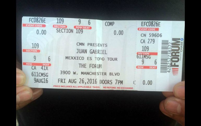 CIUDAD DE MÉXICO (28/AGO/2016).- Algunos de los admiradores del cantautor Juan Gabriel que tuvieron la oportunidad de disfrutar el pasado viernes del último concierto de "El Divo de Juárez" en Los Ángeles, California , han comenzado a subir a sus redes sociales el boleto que da testimonio del acontecimiento.Uno de los afortunados compartió una fotografía de su boleto, que corresponde a la sección 109, fila nueve y asiento 6. También se puede ver la hora de la cita para el concierto, las 19:00 horas.El "show" formó parte de la gira "Mexxico es todo Tour", en la que Juan Gabriel brindaría al menos 15 presentaciones en varias sedes de Estados Unidos. Esta noche tenía contemplado actuar en El Paso, Texas.También tenía programadas las visitas a Tacoma, Washington; Fresno, California; Rosemont, Illinois; Carolina del Norte; Brooklyn, Nueva York; Phoenix, Arizona, entre otras ciudades.+Lee más noticias sobre la muerte de Juan Gabriel