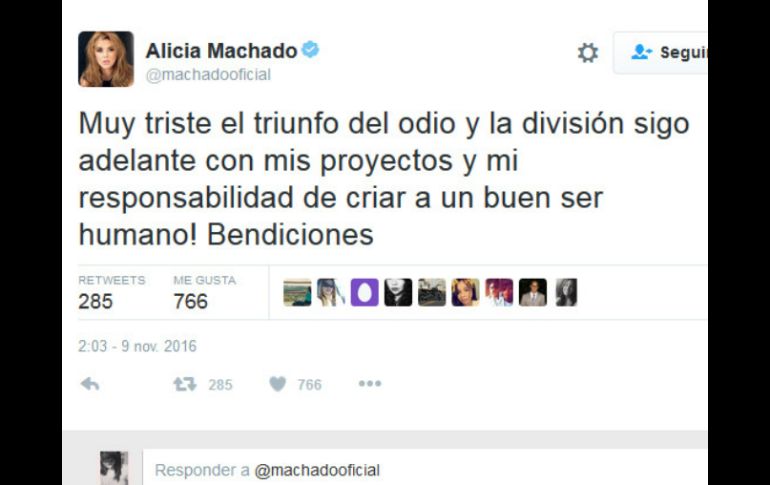 CIUDAD DE MÉXICO (09/NOV/2016).- La actriz venezolana Alicia Machado se dijo triste luego del triunfo de Donald Trump en las elecciones de Estados Unidos.A través de su cuenta de Twitter, Machado escribió algunos mensajes sin mencionar de manera directa a Trump.“Agradezco inmensamente a las personas que me brindaron su apoyo y cariño. El respeto a las mujeres seguirá siendo una lucha día tras día”.“Muy triste el triunfo del odio y la división. Sigo adelante con mis proyectos y mi responsabilidad de criar a un buen ser humano! Bendiciones”, añadió Alicia, quien escribió en otro comentario que está “dignamente triste”, pero satisfecha por lo que hizo.La ex Miss Universo se convirtió en centro de debate entre Donald Trump y Hillary Clinton cuando recordó el maltrato que le dio el empresario.En un video que se compartió en redes de Clinton, Machado recordó cómo fue humillada por Trump por ser latina y por haber subido de peso.Hace unos meses obtuvo la ciudadanía estadounidense y dijo que votaría contra Trump.