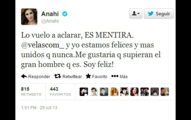 Entretenimiento | La cantante desmiente rumores de separación con el gobernador de Chiapas Anahí defiende compromiso con Manuel Velasco La cantante desmiente rumores de separación con el gobernador de Chiapas Por: EL INFORMADOR 29 de octubre de 2013 - 17:27 hs Anahí aclaró que su relación con el político sigue, a través de un mensaje de Twitter. ESPECIAL / GUADALAJARA, JALISCO (29/OCT/2013).- Luego que en las redes sociales circulara la noticia del rompimiento de la relación entre la cantante Anahí y el gobernador de Chiapas, Manuel Velasco; la también actriz desmintió el rumor en Twitter y dejó claro que siguen juntos. ''ES MENTIRA. @velascom_ y yo estamos felices y más unidos que nunca. Me gustaría que supieran el gran hombre que es. Soy feliz.'' escribió la cantante pocos minutos después de darse a conocer la nota publicada por una revista de espectáculos. Según una amiga de la cantante, Velasco le habría sido infiel con una de sus colaboradoras y la actriz habría roto su compromiso. Al tuit que anunciaba la nota, la cantante respondió en Twitter: ''¡Mentira total! Llevamos un año y medio de novios y Manuel es un hombre de valores de una sola pieza. Soy muy feliz.'' La versión digital del medio, da más detalles de la situación y enlista tres motivos, entre ellos que el político pospuso su boda para este noviembre y la insistencia de la cantante para que su familia permaneciera a su lado aún estando casada así como la supuesta infidelidad por parte de él. Temas Farándula Anahí Escándalos de la farándula Lee También ¿Cuál era la relación entre el barco pirata hundido en Vallarta y Colón? ¿Qué hundió al barco pirata "Marigalante" en Vallarta? Alcalde de Tulum anuncia acceso libre a playas, pero sin alimentos ni bebidas Ulises Dávila se declara culpable por amaño de partidos Recibe las últimas noticias en tu e-mail Todo lo que necesitas saber para comenzar tu día Registrarse implica aceptar los Términos y Condiciones