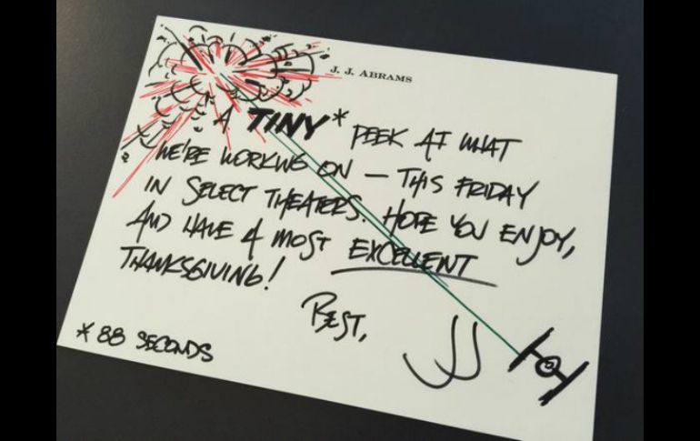 Entretenimiento | Un trailer de 88 segundos será proyectado en algunas salas de cine escogidas Avance de nueva entrega de 'Star Wars' será lanzado este viernes Un trailer de 88 segundos será proyectado en algunas salas de cine escogidas Por: AFP 24 de noviembre de 2014 - 15:21 hs A falta de confirmación de las productoras, el director publicó en redes sociales el estreno del tráiler. TWITTER / @Bad_Robot. LOS ÁNGELES, ESTADOS UNIDOS (24/NOV/2014).- Un tráiler de la nueva película de la saga " La Guerra de las Galaxias" será lanzado el viernes, según el director de la próxima y séptima película de la popular franquicia. "Un pequeño vistazo sobre lo que estamos trabajando - este viernes en salas escogidas", escribió en la red social Twitter el cineasta J.J. Abrams, acotando que el avance tendrá de 88 segundos de duración. "Espero que lo disfruten, y tengan un día de Acción de Gracias excelente", dijo, refiriéndose a la fiesta nacional de Estados Unidos este jueves. Las filmaciones del Episodio VII comenzaron en Gran Bretaña en mayo. A principios de este mes la gigante cinematográfica Disney reveló el nombre de la nueva película será "Star Wars: La Fuerza Despierta", diciendo se terminaron de rodar las escenas de la película, que se espera lanzar el 18 de diciembre de 2015. Miembros originales como Harrison Ford, Carrie Fisher y Mark Hamill actuarán en la nueva cinta junto a novatos de la saga como la ganadora del Oscar, Lupita Nyong'o. "Star Wars" ha atraído a generaciones de fieles seguidores desde que vio salir la primera película de la saga en 1977, narrando las aventuras del joven Luke Skywalker, el capitán Han Solo y el maléfico Darth Vader. Temas Cine Películas Star Wars Recibe las últimas noticias en tu e-mail Todo lo que necesitas saber para comenzar tu día Registrarse implica aceptar los Términos y Condiciones
