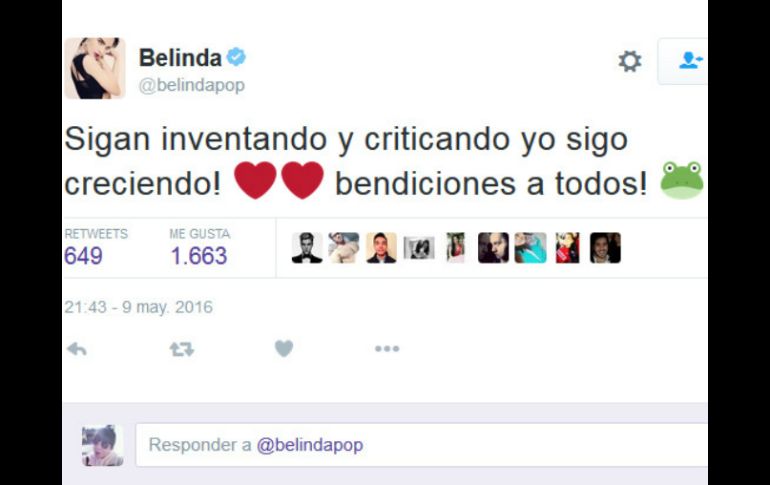Entretenimiento | La cantante utiliza su cuenta de Twitter para responder a las críticas Belinda responde a polémica de 'Lady Sapito' 'Me da mucha risa que no saben diferenciar y darse cuenta que todo es parte del show', escribe la cantante Por: SUN 10 de mayo de 2016 - 10:27 hs CIUDAD DE MÉXICO (10/MAY/2016).- Luego de la polémica que enfrentó y que la llevó a ser llamada “#LadySapito” en Twitter, la cantante Belinda usó su cuenta de Twitter para responder. Belinda se presentó hace unos días en Cancún y la gente le pidió que cantara “Sapito”, a lo que ella respondió: “¡¿Es en serio?! Teniendo tantos años de carrera, tantas canciones…¿siempre me van a pedir 'El sapito'?”. Tal respuesta generó críticas y rechazó, pero hace unas horas en Twitter la cantante escribió: “Me da mucha risa que no saben diferenciar y darse cuenta que todo es parte del show!!”, acompañada de una imagen en tonos verdes en la que se puede leer la leyenda: 'Keep Calm and Sapito'. Y poco después añadió: “Sigan inventando y criticando yo sigo creciendo! bendiciones a todos!”. Temas Farándula Cantantes Belinda Twitter Escándalos de la farándula Lee También Ángel Covarrubias, la voz infantil que conquistó Zapopan Alcalde de Tulum anuncia acceso libre a playas, pero sin alimentos ni bebidas Ministerio Público decreta estas medidas en favor de Belinda tras denunciar a Lupillo La historia de Belinda y Lupillo a través de los años Recibe las últimas noticias en tu e-mail Todo lo que necesitas saber para comenzar tu día Registrarse implica aceptar los Términos y Condiciones