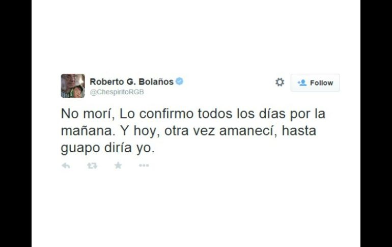 Entretenimiento | El comediante tuvo que desmentir en numerosas ocasiones su muerte, siempre con humor 'Chespirito' bromeaba en Twitter sobre su muerte El comediante tuvo que desmentir en numerosas ocasiones su muerte, siempre con humor Por: SUN 29 de noviembre de 2014 - 08:47 hs CIUDAD DE MÉXICO (29/NOV/2014).- “Chespirito” siempre tomó con humor el asunto de su propia muerte a través de su cuenta oficial de Twitter @ChespiritoRGB, donde además de compartir que en esta etapa de su vida apenas estaba aprendiendo a usar la tecnología, no perdió oportunidad para escribir respecto a la fecha que ya llegó en la vida real. "Fíjense que hoy chequé y no, todavía no me muero... Ni en twitter, ni en ningún otro lado. Saludos de su amigo Chespirito.", escribió el 24 de octubre de 2012. Más adelante, el 1 de febrero de 2013, escribió por el mismo medio: "Que conste, yo avisé que esto no es mi fuerte ¿Me perdonan cuando me ausente unos días?. Y no, no me he muerto, ni en Twitter. Chespirito". Ante la insistencia de algunos por difundir su fallecimiento, el comediante tuvo que salir a decir que no, que nuevamente no estaba muerto y posteó: "¿Será que alguien lleva la cuenta de cuántas veces me han dado por muerto?". La verdad es que “El Chavo”, “Chespirito”, o Roberto, aprendió a usar Twitter con el paso del tiempo y con la ayuda de sus familiares, y lo mismo compartía alguna que otra foto con sus perritos que opiniones políticas, de futbol o felicitaciones y hasta cosas como que se iba a "poner guapo" a "bañar" o un simple "no quiero". "¿con RT o sin RT?... Es que no me tienen paciencia... Bueno pero no se enojen... Tómenlo por el lado amable. Ya me voy a bañar, Regreso." tuiteó en 2011. Aunque a veces se disculpaba por ausentarse de la red social, siempre agradeció que más de seis millones de personas lo siguieran. "Para qué quieren mi perfil si soy más guapo de frente" se leía en su descripción de Twitter. Temas Farándula Decesos actores Roberto Gómez Bolaños Chespirito Twitter Decesos de personalidades Lee También Fallece John Lodge, bajista de The Moody Blues Andrew Garfield sueña con unirse a “Wolverine” en Marvel Angelina Jolie exige compensación a Brad Pitt Belinda denuncia a Lupillo Rivera Recibe las últimas noticias en tu e-mail Todo lo que necesitas saber para comenzar tu día Registrarse implica aceptar los Términos y Condiciones