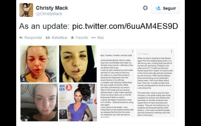 Entretenimiento | La actriz para cine de adultos comparte su recuperación a través de su Twitter Christy Mack muestra su recuperación tras golpiza de su ex La actriz para cine de adultos comparte su recuperación a través de su cuenta de Twitter Por: SUN 16 de septiembre de 2014 - 11:05 hs El rostro de Christy sólo requirió de pocas cirugías para reparar el daño que provocó el apodado 'War Machine'. TWITTER @ChristyMack / CIUDAD DE MÉXICO (16/SEP/2014).- Luego de la brutal paliza que recibió por parte del peleador Jon Koppenhaver (su ex pareja), la cual le provocó muchas lesiones, la actriz porno Christy Mack se encuentra en un exitoso proceso de recuperación y esto lo mostró a través de su cuenta de redes sociales. Pero no sólo eso, el portal TMZ, también estuvo presente en su reaparición pública, pues la abordó a la salida de un evento sobre violencia doméstica. El rostro de Christy sólo requirió de pocas cirugías para reparar el daño que provocó el apodado War Machine en la nariz y boca, según sus propias declaraciones. Christy Mack, quien es conocida por hacerse del premio AVN (llamado también el Oscar porno) en 2014 en la categoría Actriz Joven Más Prometedora, dijo que el apoyo de sus amigos y su familia la hizo sentirse mejor. Sobre las imágenes que subió a su cuenta de Instagram escribió un mensaje que damos a conocer a grandes rasgos: “2 días, 2 semanas, 4 semanas, y ayer por la noche. Todavía tengo varias visitas al dentista. Me han revisado mis ojos y soy muy afortunada de tener mi visión. Mis múltiples fracturas de la nariz se repararán. Aunque soy bastante simétrica, mi nariz se desplaza en el interior y hacia fuera causando problemas respiratorios. “Mi labio superior recuperará su pleno movimiento en menos de 6 meses... Mi hígado parece estar bien. Aunque mi cara está empezando a parecer decente, todavía no es la mía. “Cortar lo que quedaba de mi pelo y perder peso me hizo sentir aún más lejos de mí. Es difícil mirarse en el espejo todos los días y ver a alguien diferente. Después de maquillarme vestirme para un evento de caridad, me sentí mucho mejor de cómo me veo ahora. Esto me hizo sentir más normal y hermosa”, publicó. Cabe decir, que ella visitó una organización benéfica que financia cirugías para mujeres y niños que han estado en situaciones de violencia, lo que les obligan a ser intervenidos reconstructivamente. Aclaró que ellos “no financian mis cirugías, éstas son donadas por otros médicos; pero ahí conocí a gente maravillosa y esperaremos trabajar juntos”. Temas Farándula Actor- Actriz Twitter Escándalos de la farándula Escándalos en redes sociales Lee También Esta es la verdadera identidad del "Juan Gabriel" captado en París "Streamer" transmite su parto en vivo y causa revuelo en redes sociales Así puedes comenzar tu ahorro en el Banco del Bienestar CURP biométrica: ¿Será necesario tramitarla para los programas del Bienestar? Recibe las últimas noticias en tu e-mail Todo lo que necesitas saber para comenzar tu día Registrarse implica aceptar los Términos y Condiciones