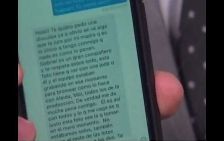 Entretenimiento | La actriz mostró los mensajes en los que se disculpó con la esposa de Gabriel Soto Difunden mensajes entre Marjorie y Geraldine Bazán La actriz venezolana mostró los mensajes en los que se disculpó con la esposa de Gabriel Soto Por: SUN 27 de abril de 2016 - 16:12 hs CIUDAD DE MÉXICO (27/ABR/2016).- La actriz venezolana, Marjorie de Sousa rompió el silencio ante las versiones que la tuvieron en el “ojo del huracán” las últimas semanas. Y es que el día de ayer se transmitió a través del programa “El Gordo y la Flaca” la entrevista exclusiva que realizó Gustavo Adolfo Infante a la actriz venezolana, en donde esta habló de las fotografías que la vincularon con Gabriel Soto. En dicha emisión, el periodista de espectáculos mostró los mensajes que Marjorie se envió con Geraldine Bazán, esposa de Gabriel Soto, para explicarle que las cosas no eran como se habían presentado en los medios de comunicación. Le pidió disculpas y le aclaró que todo era parte de una dinámica en la que estaban presentes toda la producción. Y es que semanas atrás, una revista de espectáculos de circulación nacional publicó una serie de fotografías en donde aparentemente Gabriel Soto y Marjorie de Souza estaban en una situación comprometedora en las playas de Quintana Roo. A las pocas horas de que se divulgara la entrevista, Geraldine publicó un mensaje a través de su cuenta de Twitter en donde expresaba “Ayyyyy ya! Que flojera”, sin aclarar si se refería a las declaraciones de la venezolana. Temas Farándula Gabriel Soto Geraldine Bazán Escándalos de la farándula Lee También Esta es la verdadera identidad del "Juan Gabriel" captado en París "Streamer" transmite su parto en vivo y causa revuelo en redes sociales Portada: Dr. José Magaña, embajador de Arkana México Los mejores MEMES que dejó la gran final de La Casa de los Famosos México Recibe las últimas noticias en tu e-mail Todo lo que necesitas saber para comenzar tu día Registrarse implica aceptar los Términos y Condiciones