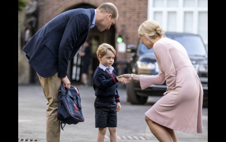 LONDRES, INGLATERRA (07/SEP/2017).- El príncipe Jorge de Inglaterra acudió hoy a la escuela Thomas's Battersea, en Londres, en su primer día de colegio, pero no estuvo acompañado por su madre, la duquesa de Cambridge, que padece náuseas producidas por su embarazo.El príncipe, vestido con el uniforme de esta prestigiosa escuela privada, fue llevado en coche por su padre, el duque de Cambridge, desde el palacio de Kensington, su residencia oficial.El palacio informó hoy de que la duquesa de Cambridge no podía acudir a la escuela, en uno de los días más importantes para el pequeño de cuatro años, debido a que no se encuentra bien."Desafortunadamente, la duquesa de Cambridge sigue sintiéndose mal, y no podrá acompañar al príncipe Jorge en su primer día de colegio. El duque de Cambridge lo llevará esta mañana como estaba planeado", señaló un escueto comunicado divulgado por el palacio poco antes de que el menor llegase a la escuela.La residencia real ha indicado que el príncipe, tercero en la línea de sucesión a la corona británica, será conocido por sus compañeros de clase como Jorge Cambridge.Al llegar de la mano de su padre, el príncipe saludó a la directora, Helen Haslem, tras lo cual todos entraron al edificio.El pequeño iba vestido con un jersey de color azul marino, pantalones cortos, medias rojas y zapatos negros.Se espera que Jorge pase la jornada conociendo a sus maestros y sus compañeros de clase para adaptarse a su nuevo ambiente escolar.Esta semana, el palacio de Kensington informó de que los duques de Cambridge esperan su tercer hijo, que será el sexto bisnieto de la reina Isabel II de Inglaterra, de 91 años.El tercer hijo de los duques será quinto en la línea de sucesión a la corona británica, por detrás del príncipe Carlos; su padre, el príncipe Guillermo, y sus hermanos Jorge y Carlota.