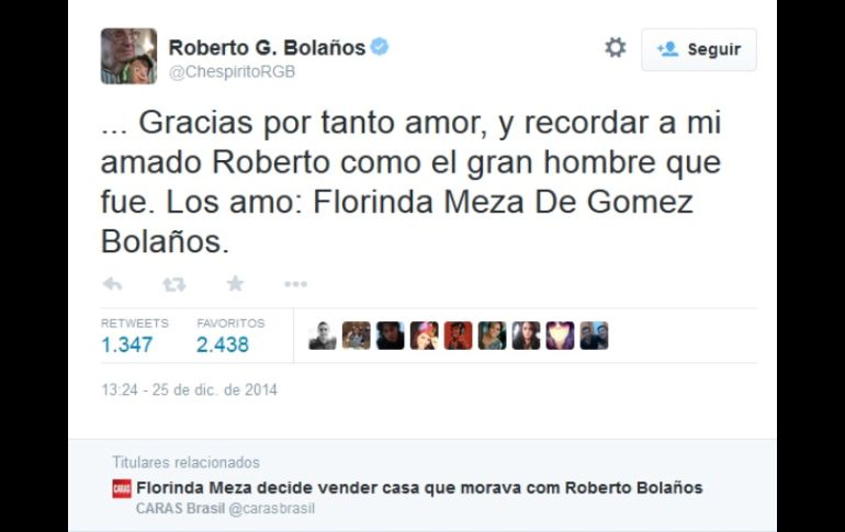 Entretenimiento | Comparte en la cuenta de Twitter de Gómez Bolaños sus mensajes para los seguidores Florinda Meza venderá las casas de 'Chespirito' Comparte en la cuenta de Twitter de Gómez Bolaños sus mensajes para los seguidores Por: EL INFORMADOR 25 de diciembre de 2014 - 14:07 hs Algunos usuarios de Twitter critican que aprovechó para anunciar que venderá las propiedades del actor en la red. TWITTER / ChespiritoRGB GUADALAJARA, JALISCO (25/DIC/2014).- A través de Twitter, Florinda Meza, ex esposa de Roberto Gómez Bolaños, agradeció el apoyo que ha recibido de parte de todos los fanáticos de 'Chespirito' y además, aprovechó para anunciar que venderá las propiedades que pertenecían al actor. "Gracias por tanto amor a mi Rober. Feliz Navidad a todos los que le dieron tanto, y siguen llenando este espacio de palabras hermosas me hacen mas llevadero este doloroso momento. He decidido vender las casas en las que compartimos tantos años de felicidad, tal como él las disfrutó, con cada mueble y cada espacio, en Cancún y en Ciudad de México. Es demasiado grande para mi. Una vez más gracias por tanto amor, y recordar a mi amado Roberto como el gran hombre que fue. Los amo: Florinda Meza De Gomez Bolaños". El mensaje fue publicado en la cuenta del también director, @ChespiritoRGB, en cuatro tuits los cuales fueron firmados por Florinda. SABES MÁS: Roberto Gómez Bolaños falleció el pasado 28 de noviembre a los 85 años de edad en su residencia en Cancún, Quintana Roo. EL INFORMADOR/ PATRICIA GALLARDO Temas Farándula Roberto Gómez Bolaños Chespirito Herencia Florinda Meza Twitter Lee También Belinda denuncia a Lupillo Rivera KIVA Inversión inmobiliaria integral presenta Atriva, esencia viva Presentan Plan México ante empresarios del Foro Mundial IberoMedia Global realiza su primer Encuentro Empresarial Internacional Recibe las últimas noticias en tu e-mail Todo lo que necesitas saber para comenzar tu día Registrarse implica aceptar los Términos y Condiciones