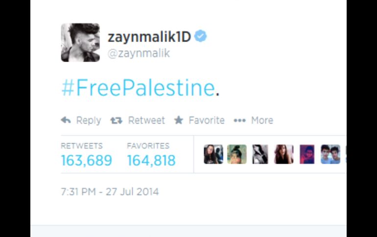 Entretenimiento | Zayn Malik es criticado por el tuit que escribe en referencia al conflicto en Gaza Integrante de One Direction, amenazado de muerte Zayn Malik es criticado por el tuit que escribe en referencia al conflicto en Gaza Por: SUN 28 de julio de 2014 - 13:05 hs El comentario tiene más de 150 mil retuits y ha sido marcado como favorito el mismo número de ocasiones. ESPECIAL / CIUDAD DE MÉXICO (28/JUL/2014).- De acuerdo con " The Independent", Zayn Malik, integrante de One direction fue sumamente criticado e incluso recibió amenazas de muerte luego de escribir un tuit sobre el conflicto que existe en la Franja de Gaza. El comentario de Zyan Malik tiene más de 150 mil retuits y ha sido marcado como favorito en el mismo número de ocasiones, hasta el momento el cantante no emitido otra declaración, sin embargo continúan lloviendo los comentarios, la mayoría de sus seguidores le recriminan el mensaje del cantante de One Direction. Temas Farándula Cantantes Twitter One Direction Escándalos en redes sociales Lee También Belinda denuncia a Lupillo Rivera Esta es la verdadera identidad del "Juan Gabriel" captado en París Alejandra Guzmán se somete a cirugía de emergencia; ¿cuál es su estado de salud? "Streamer" transmite su parto en vivo y causa revuelo en redes sociales Recibe las últimas noticias en tu e-mail Todo lo que necesitas saber para comenzar tu día Registrarse implica aceptar los Términos y Condiciones