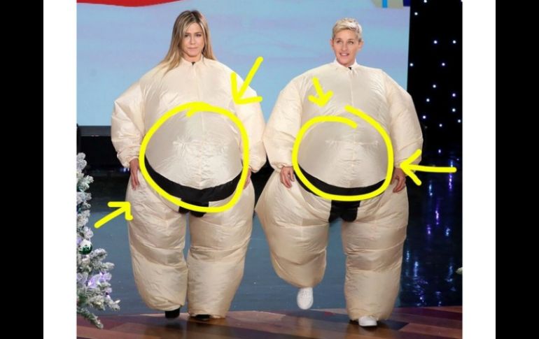 CIUDAD DE MÉXICO (30/NOV/2016).- Jennifer Aniston visitó el programa de Ellen DeGeneres y participó en un juego para el que tuvieron que disfrazarse como luchadores de sumo.Ataviadas con los trajes, que les impedían moverse bien, iniciaron el concurso que consistía en hacer mímica para que la otra persona adivinara la actividad.Jennifer logró que DeGeneres acertara en varias de sus actividades y para lograrlo no dudó acostarse en el suelo, con dificultad.A DeGeneres le tocó hacer una postura de yoga y hacer como si bailara ballet.Cuando iban a iniciar el juego, Ellen bromeó con Aniston sobre el hecho de que verse así podría levantar de nueva cuenta los rumores de embarazo que la han seguido durante años.Sin embargo, un representante de la actriz negó rotundamente la información.