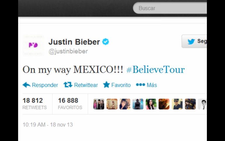 Entretenimiento | El cantante ofrecerá conciertos en el Foro Sol de México Justin Bieber, de camino a México Justin Bieber tuiteó ''En camino MEXICO!!! #BelieveTour'' hace poco más de una hora Por: SUN 18 de noviembre de 2013 - 13:03 hs Tuit de Justin Bieber, acerca de su concierto en México. ESPECIAL / CIUDAD DE MÉXICO (18/NOV/2013).- Justin Bieber, inmerso en su gira "Believe", tuiteó "En camino MEXICO!!! #BelieveTour", haciendo referencia a las presentaciones que realizará este lunes y mañana martes en el Foro Sol de la Ciudad de México ante más de 50 mil "Believers". El tuit del joven astro del pop fue bien recibido por sus fans, quienes, en instantes, incrementaron en decenas de miles los retuits y "favs" su mensaje. Ayer domingo, mientras tramoyistas, iluminadores e ingenieros de audio ultimaron detalles en el escenario del Foro para que los shows del cantante de "Baby", las fans se apostaron afuera de un hotel de Polanco, donde creían se hospedaría el ídolo juvenil. Ante el arribo de más de 3 mil jovencitas al lugar, se implementó un dispositivo con unos 250 granaderos para vigilar las inmediaciones. Bieber concluye en México su gira por América Latina, que ha estado marcada por los escándalos. Después de su estancia en la capital mexicana, el cantante continuará con su tour en Nueva Zelanda y diferentes ciudades de Australia. Temas Conciertos Cantantes Foro Sol Twitter Justin Bieber Lee También Ticketmaster tiene todos estos conciertos al 2x1 en Ciudad de México Lista de conciertos en Guadalajara que están al 2x1 en Ticketmaster Fiestas de Octubre 2025: cartelera por fecha en el Auditorio Benito Juárez Fiestas de Octubre en Guadalajara: 60 años siendo la feria más mexicana Recibe las últimas noticias en tu e-mail Todo lo que necesitas saber para comenzar tu día Registrarse implica aceptar los Términos y Condiciones