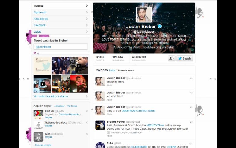 Entretenimiento | El cantante canadiense cuenta con más de 40 millones de seguidores Justin Bieber es el nuevo rey en Twitter El cantante canadiense cuenta con más de 40 millones de seguidores en la red social Por: EFE 6 de junio de 2013 - 21:18 hs Justin Bieber es la primera persona que alcanza una cifra tan alta en Twitter. ARCHIVO / LOS ÁNGELES, ESTADOS UNIDOS (06/JUN/2013).- El joven cantante Justin Bieber se ha convertido en el nuevo rey de la red social Twitter, donde ha superado ya la barrera de los 40 millones de seguidores, una cifra superior a la de artistas como Lady Gaga o Katy Perry. Bieber es la primera persona que alcanza ese número en Twitter. Gaga acaba de superar los 38 millones y Perry se encamina hacia los 37.5 millones. El presidente de Estados Unidos, Barack Obama, ocupa el cuarto lugar con 32.4 millones. La cantante Rihanna es quinta con 28.9 millones. Por detrás de ellos se encuentran Taylor Swift, el portal YouTube, Britney Spears, Justin Timberlake y la colombiana Shakira. Bieber alcanzó la marca el martes 4 de junio, el mismo día que anunció el título de su nuevo sencillo, "Heartbreaker". Dio las gracias a sus fans y escribió: "#40millionstrong". Según un análisis de la web Radian6, especializada en estudiar los movimientos de la red social, unos 100 millones de usuarios emplearon ese hashtag (etiqueta) desde entonces. El portal SocialBakers, que revisa el número de seguidores reales y falsos de cada cuenta, sostiene que el 44% de los "followers" de Bieber en Twitter son falsos (cuentas de spam), el 21% están inactivos y sólo el 35% pueden ser considerados "reales". Hoy se dio a conocer que Bieber viajará como turista al espacio gracias a los viajes siderales de la compañía Virgin Galactic, según informó el dueño de la empresa y magnate británico, Richard Branson. Una aventura en la que el cantante de 19 años estará acompañado por su representante, Scooter Braun. "Es estupendo saber que Justin Bieber y Scooter Braun serán los próximos astronautas de Virgin Galactic. ¡Enhorabuena, os veo allí arriba!", anunció Branson en su perfil de Twitter. Bieber logrará así cumplir parcialmente sus deseos después de que el pasado 23 de febrero publicara en su cuenta de Twitter que quería "hacer un concierto en el espacio". La compañía de Branson formalizará la fantasía del intérprete con un vuelo de dos horas en el que Bieber podrá experimentar seis minutos de ingravidez y por el que el artista debería pagar alrededor de 140 mil euros (183 mil 119 dólares). El viaje se realizará con la nave SpaceShipTwo, del tamaño de un jet privado y con capacidad para transportar a seis pasajeros y dos pilotos, que realizó con éxito su primer vuelo de pruebas tripulado independiente sobre el desierto de Mojave (California) en 2010. Temas Farándula Twitter Redes Sociales Justin Bieber Lee También WhatsApp prepara uno de los mayores cambios en su historia reciente La Granja VIP: Lolita Cortés sorprende con respuesta indiferente a la llegada de Sandra Itzel Concierto de "El Tri" se suspende un momento por caída de una pantalla (VIDEO) Lupillo Rivera, en la mira de la “Ley Olimpia” Recibe las últimas noticias en tu e-mail Todo lo que necesitas saber para comenzar tu día Registrarse implica aceptar los Términos y Condiciones