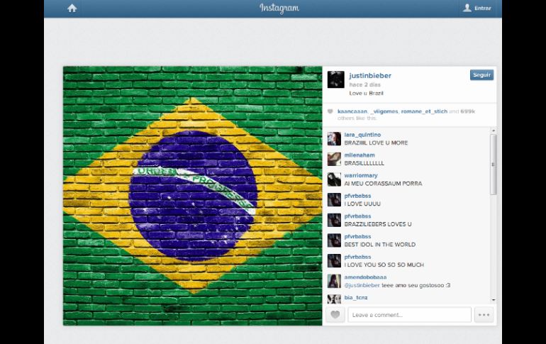 Entretenimiento | El canadiense fue agredido durante concierto Justin Bieber postea ''Love u Brazil'' tras incidente Justin Bieber publicó en Instagram una gráfica de una bandera brasileña con la leyenda ''Love u Brazil'' Por: NTX 4 de noviembre de 2013 - 09:21 hs Justin Bieber twiteo agradecimientos al público brasileño por el amor que le demuestran. ESPECIAL / SANTIAGO, BRASIL (04/NOV/2013).- El cantante canadiense Justin Bieber publicó en su cuenta de Instagram una gráfica de una bandera brasileña con la leyenda "Love u Brazil", solo horas después de que abandonó abruptamente un concierto que brindaba en Sao Paulo. Bieber, además, twiteo agradecimientos al público brasileño por el amor que le demuestran, sin hacer referencia al incidente que le hizo abandonar el escenario de la Arena Anhembi, tras recibir un botellazo que le botó el micrófono, informaron medios brasileños. El sábado por la noche, el afamado intérprete juvenil cantaba el tema "Boyfriend" cuando repentinamente una botella de agua lanzada desde el público impactó en su mano izquierda. "Por causa del incidente, el artistas concluyó su presentación antes de lo previsto", señaló Folha de Sao Paulo en su página electrónica. Gran parte de las 35 mil personas que asistieron al concierto clamaron para que regresara al escenario, pero sus gritos y llantos fueron infructuosos. Temas Música Conciertos Brasil Justin Bieber Instagram Lee También Ticketmaster tiene todos estos conciertos al 2x1 en Ciudad de México Lista de conciertos en Guadalajara que están al 2x1 en Ticketmaster Fiestas de Octubre 2025: cartelera por fecha en el Auditorio Benito Juárez Fiestas de Octubre en Guadalajara: 60 años siendo la feria más mexicana Recibe las últimas noticias en tu e-mail Todo lo que necesitas saber para comenzar tu día Registrarse implica aceptar los Términos y Condiciones
