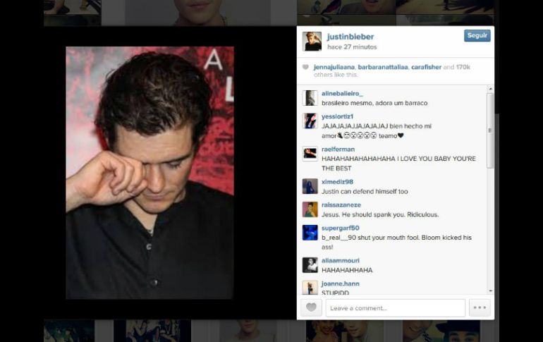Entretenimiento | El cantante canadiense subió una foto donde aparece el actor con gesto de tristeza Justin Bieber se burla de Orlando Bloom en Instagram El cantante canadiense subió una foto donde aparece el actor con gesto de tristeza Por: EL INFORMADOR 30 de julio de 2014 - 17:21 hs Bloom no ha declarado al respecto. ESPECIAL / GUADALAJARA, JALISCO (30/JUL/2014).- Siguiendo con la polémica sobre el encuentro poco amistoso entre Justin Bieber y Orlando Bloom en Ibiza, esta tarde el cantante canadiense subió una foto a su cuenta de twitter del actor de Piratas del Caribe, en donde se éste aparenta un gesto de tristeza. Justin no agregó una descripción a la fotografía y es que en realidad no hace falta, pues esta sería más bien la respuesta que no le pudo dar al actor luego de los empujones y hasta un puñetazo que ambos intercambiaron la noche anterior afuera del restaurante Cipriani en Ibiza. Algunos sitios de espectáculos como el TMZ especulan sobre cuál sería el motivo por el que tuvieron este intenso encuentro. Algunos rumores sostienen que Bieber intentó saludar a Bloom y éste le negó el gesto, otro dicho señala que Justin le hizo un indiscreto comentario al actor: "Tuve sexo con tu esposa", refiriéndose a la supermodelo Miranda Kerr. Hasta el momento, Orlando Bloom no ha declarado al respecto, sin embargo, el video que captó el encuentro logra gran popularidad en redes sociales. EL INFORMADOR / CAROLINA QUINTANILLA Temas Farándula Orlando Bloom Escándalos de la farándula Miranda Kerr Justin Bieber Lee También Alcalde de Tulum anuncia acceso libre a playas, pero sin alimentos ni bebidas Ulises Dávila se declara culpable por amaño de partidos Belinda denuncia a Lupillo Rivera "Streamer" transmite su parto en vivo y causa revuelo en redes sociales Recibe las últimas noticias en tu e-mail Todo lo que necesitas saber para comenzar tu día Registrarse implica aceptar los Términos y Condiciones