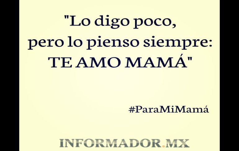 Entretenimiento | Manda tu frase con dedicatoria a tu madre usando #ParaMiMamá Lo que no le hemos dicho a mamá Manda tu frase con dedicatoria a tu madre usando #ParaMiMamá Por: EL INFORMADOR 5 de mayo de 2016 - 16:38 hs Es momento de aprovechar para decirle a mamá todo lo que no has podido decirle este 10 de mayo. ESPECIAL / C. Quintanillla GUADALAJARA, JALISCO (05/MAY/2016).- Para este 10 de Mayo queremos ayudarte a decirle a tu mamá todo aquello que no le has podido decir durante mucho tiempo. Mándanos una imagen o la frase ideal que le quieras dedicar usando #ParaMiMamá. Nosotros las reuniremos en un video que será publicado en nuestro sitio el martes 10 de mayo y que tú podrás dedicárselo desde tu muro de Facebook o Twitter. IMPORTANTE: La frase tiene que ser corta, de tu autoría y especificando el nombre y/o apodo de tu mamá. Tienes hasta este domingo 08 de mayo a las 20:00 horas para participar desde Instagram, Facebook y/o Twitter. Temas Día de las Madres Facebook Calor de hogar Twitter Redes Sociales Lee También Suben termómetros en Guadalajara y se espanta la lluvia este martes WhatsApp prepara uno de los mayores cambios en su historia reciente La Granja VIP: Lolita Cortés sorprende con respuesta indiferente a la llegada de Sandra Itzel Concierto de "El Tri" se suspende un momento por caída de una pantalla (VIDEO) Recibe las últimas noticias en tu e-mail Todo lo que necesitas saber para comenzar tu día Registrarse implica aceptar los Términos y Condiciones