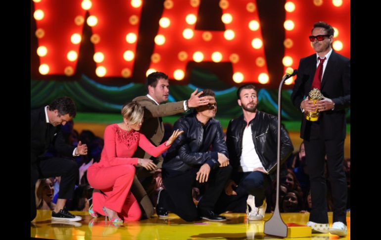 Los cinco presentaron el premio Generación que obtuvo Downey Jr.Después de entregarle el galardón, se inclinaron en el escenario mientras Downey Jr. agradecía el premio."Cuando vi los primeros MTV Movie Awards en 1992 pensé que esa era la versión del Oscar de mi generación, después en 2005 cuando vi el primer premio Generación pensé 'dónde está el mío' esperé 10 años", comentó.Downey Jr. habló de cómo tuvo éxito en el mundo del espectáculo y cómo fracasó, así como de su gusto por la fiesta. Finalmente dijo que para triunfar había que trabajar duro y aconsejó a la gente mantener limpia su nariz (en clara referencia a sus propias adicciones).Después presentó un nuevo avance de "Los Vengadores: la era de Ultrón", que se estrena a finales de este mes.