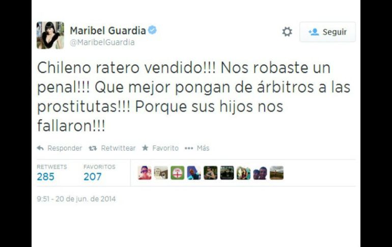 Entretenimiento | La actriz arremete contra el juez que silbó en el encuentro de Costa Rica contra Italia Maribel Guardia ataca a árbitro chileno en Twitter La actriz arremete contra el juez que silbó en el encuentro de Costa Rica contra Italia por no marcar un penal Por: EL INFORMADOR 20 de junio de 2014 - 12:30 hs Más que molesta, la cantante despotrica en su red social. ESPECIAL / GUADALAJARA, JALISCO (20/JUN/2014).- La conductora y cantante Maribel Guardia arremetió en contra del árbitro que silbó en el partido de Italia contra Costa Rica en la fase de grupos del Mundial en Brasil. En su cuenta de Twitter la actriz escribió “A pesar de que el árbitro es Putoooo!!! Costa Rica metió golazo!!! Coman Pinto Italianos”. Además, la nacida en Costa Rica, también mostró su descontento luego que al minuto 41 el juez del encuentro no señaló un penal a favor de su Selección. “Chileno ratero vendido!!! Nos robaste un penal!!! Que mejor pongan de árbitros a las prostitutas!!! Porque sus hijos nos fallaron!!!” Los mensajes han sido retomados por los usuarios de las redes sociales, ambos tienen cientos de retuits y marcas de favoritos. Al final del encuentro, la conductora publicó: “Pura Vida Costa Rica!!!! Que partidazo!!! Pego brincos!!!”. Temas Farándula Maribel Guardia Twitter Mundial Brasil 2014 Lee También Sociales: El Informador inicia una nueva etapa con la moderna imprenta "Doña Stella" Detienen a presunto extorsionador del sector limonero en Michoacán Tlaquepaque anuncia el XV Festival de Muertos 2025 con temática mundialista; conoce las fechas Todas las selecciones que han calificado al Mundial 2026 hasta hoy Recibe las últimas noticias en tu e-mail Todo lo que necesitas saber para comenzar tu día Registrarse implica aceptar los Términos y Condiciones