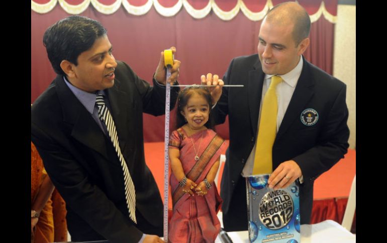 Entretenimiento | Mide 62.8 centímetros Mujer más pequeña del mundo se lleva Récord Guinness Jyoti Amge dio una estatura de 62.8 centímetros, más pequeña que una niña promedio de dos años Por: AP 16 de diciembre de 2011 - 08:10 hs NAGPUR, INDIA (16/DIC/2011).- Una estudiante de secundaria en el centro de India, a la que el libro Guinness de Records Mundiales reconoció el día de hoy como la mujer más pequeña del mundo, cumplió 18 años y expresó su esperanza de titularse y ser estrella de Bollywood, como se conoce la industria de cine india. Jyoti Amge dio una estatura de 62.8 centímetros más pequeña que una niña promedio de dos años cuando el representante de Guinness que vino de Londres la midió en una ceremonia a la que asistieron 30 parientes y amigos en la localidad de Nagpur, en el estado de Maharashtra. Amge, quien tenía lágrimas en los ojos y vestía uno de sus saris más finos, describió el honor como un "regalo extra de cumpleaños" y afirmó que estaba agradecida por ser pequeña debido a que le trajo distinción. Tras recibir el título, ella y otros invitados degustaron su pastel de cumpleaños. "He puesto a Nagpur en el mapa del mundo. Ahora todos sabrán dónde se encuentra este lugar", expresó Amge, quien dijo que sueña con convertirse algún día en estrella cinematográfica de Bollywood además de buscar un título universitario cuando termine su preparatoria este año. "Quiero ser actriz", expresó. Amge midió siete centímetros menos que la estadounidense Bridgette Jordan, de 22 años, que tenía hasta septiembre el título de la mujer más pequeña del mundo. Temas India Curiosidades y absurdos Récords Guinness Lee También "Streamer" transmite su parto en vivo y causa revuelo en redes sociales Esta es la última guerra que Trump resolvió, según él mismo Lista de frutas y alimentos que son de temporada en octubre Esta es la verdadera causa de muerte en personas con hígado graso Recibe las últimas noticias en tu e-mail Todo lo que necesitas saber para comenzar tu día Registrarse implica aceptar los Términos y Condiciones